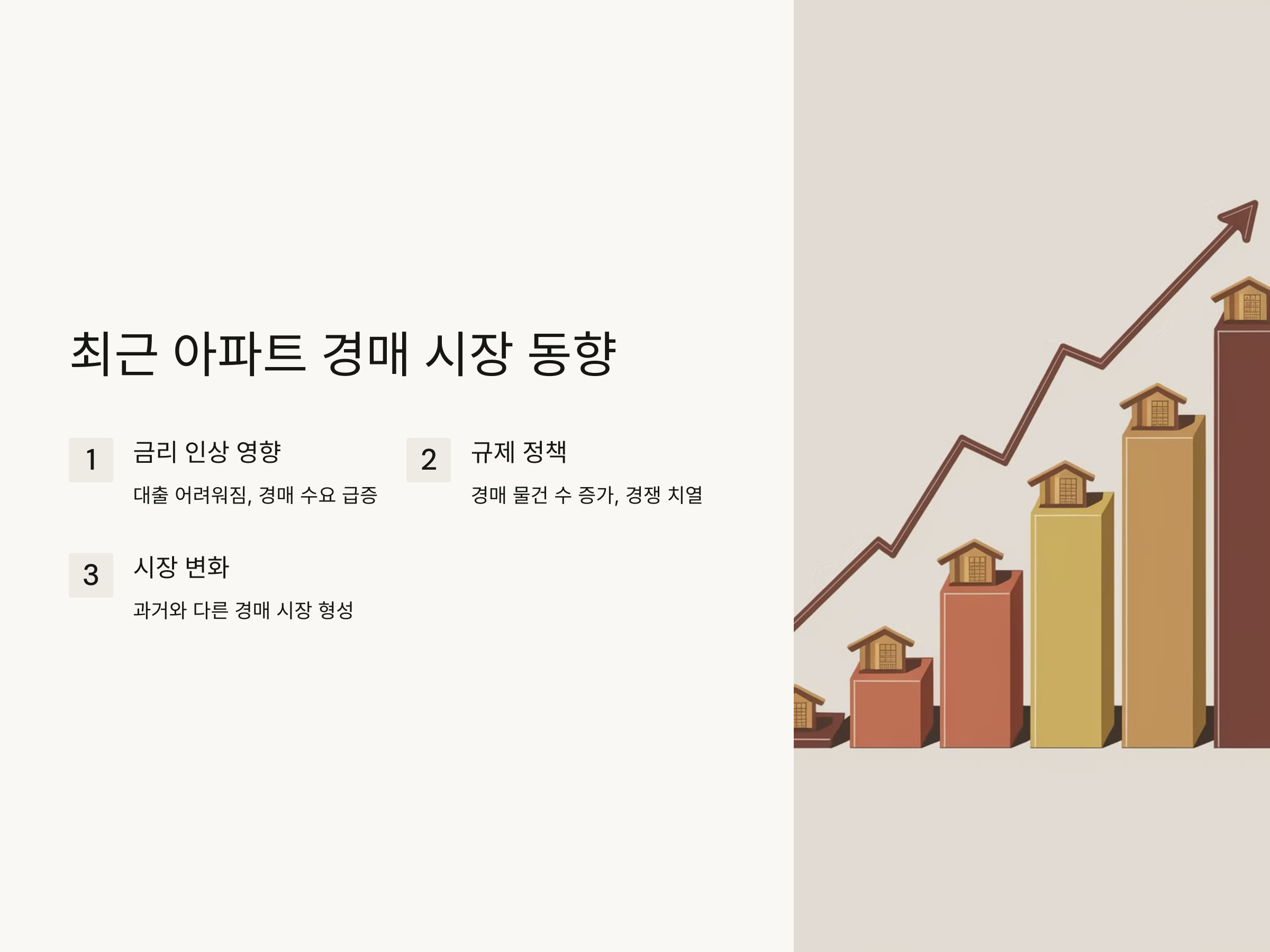 아파트 경매 시장은 과거와 다르게 변화하고 있습니다. 특히 2023년부터 이어진 금리 인상과 정부의 다양한 규제 정책들이 경매 시장에 큰 영향을 미쳤습니다. 많은 사람들이 대출을 받기 어려워지고, 일부는 대출 한도가 낮아지면서 경매로 집을 구매하려는 수요가 급증하고 있습니다. 이에 따라 아파트 경매의 물건 수도 많아지고 있지만, 경쟁도 치열해졌습니다.