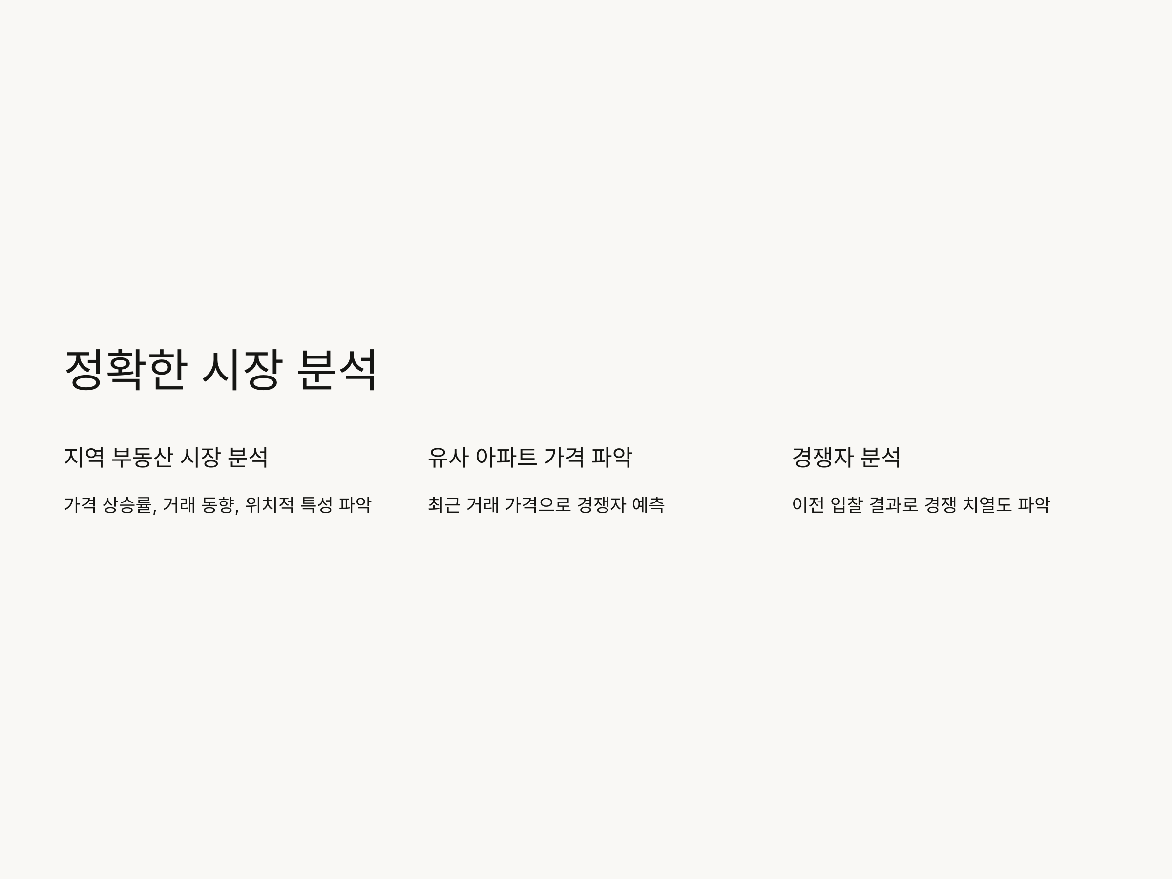 해당 지역의 유사한 아파트가 최근에 어떤 가격에 거래되었는지 확인합니다. 이 정보를 바탕으로 경매에서 경쟁자가 어떻게 입찰할지 예측할 수 있습니다.