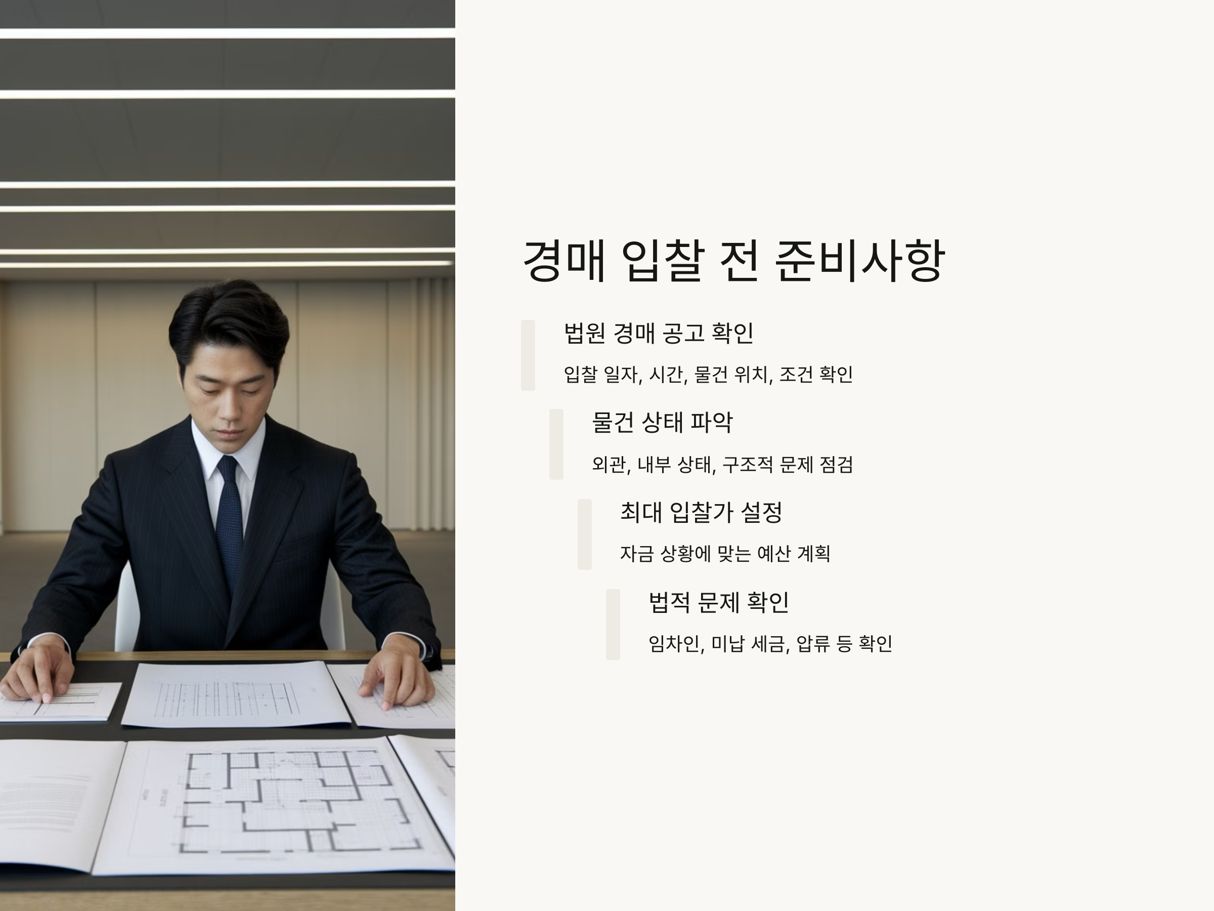 아파트 경매에 입찰하기 전에 준비해야 할 사항은 다음과 같습니다: