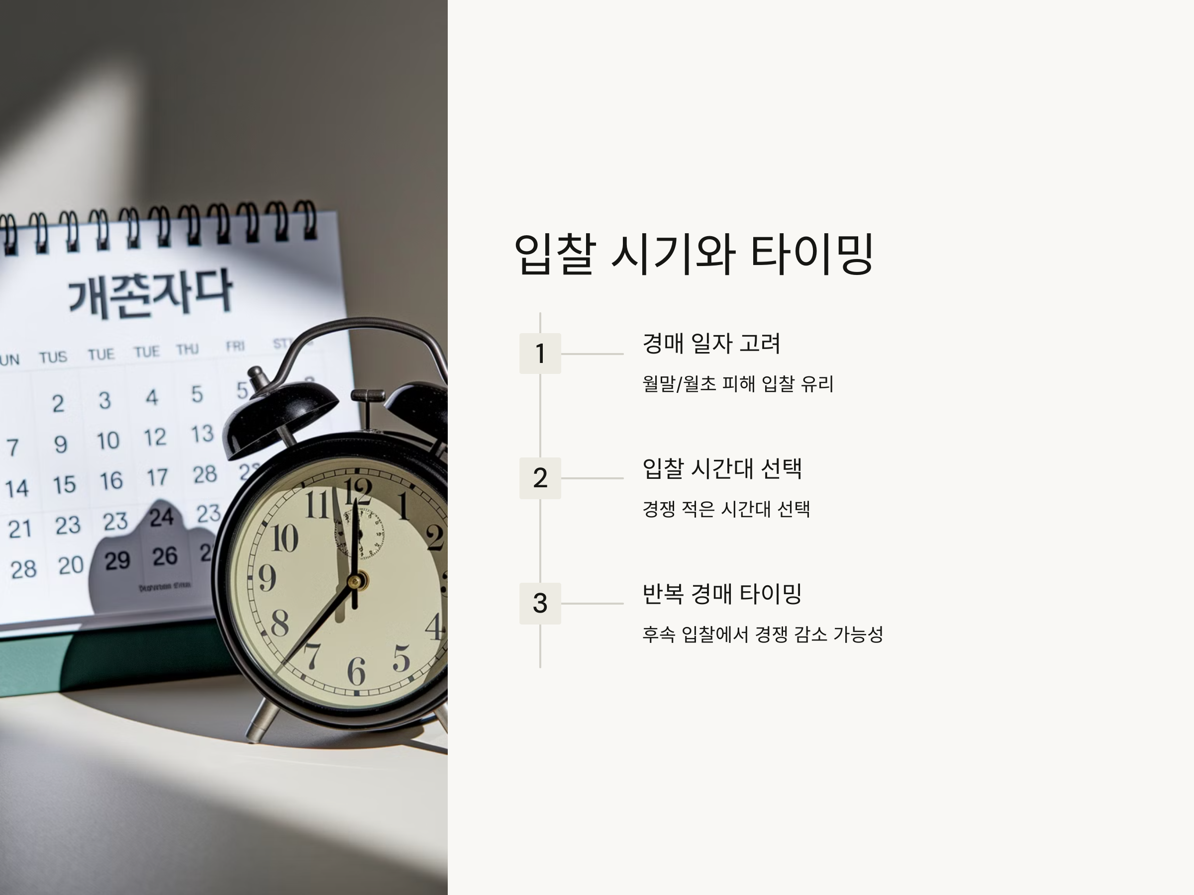 경매에서는 타이밍이 매우 중요합니다. 아파트 경매의 특성상 입찰이 몰리는 시점이 있기 때문에, 이를 잘 활용하는 것이 전략의 핵심입니다.