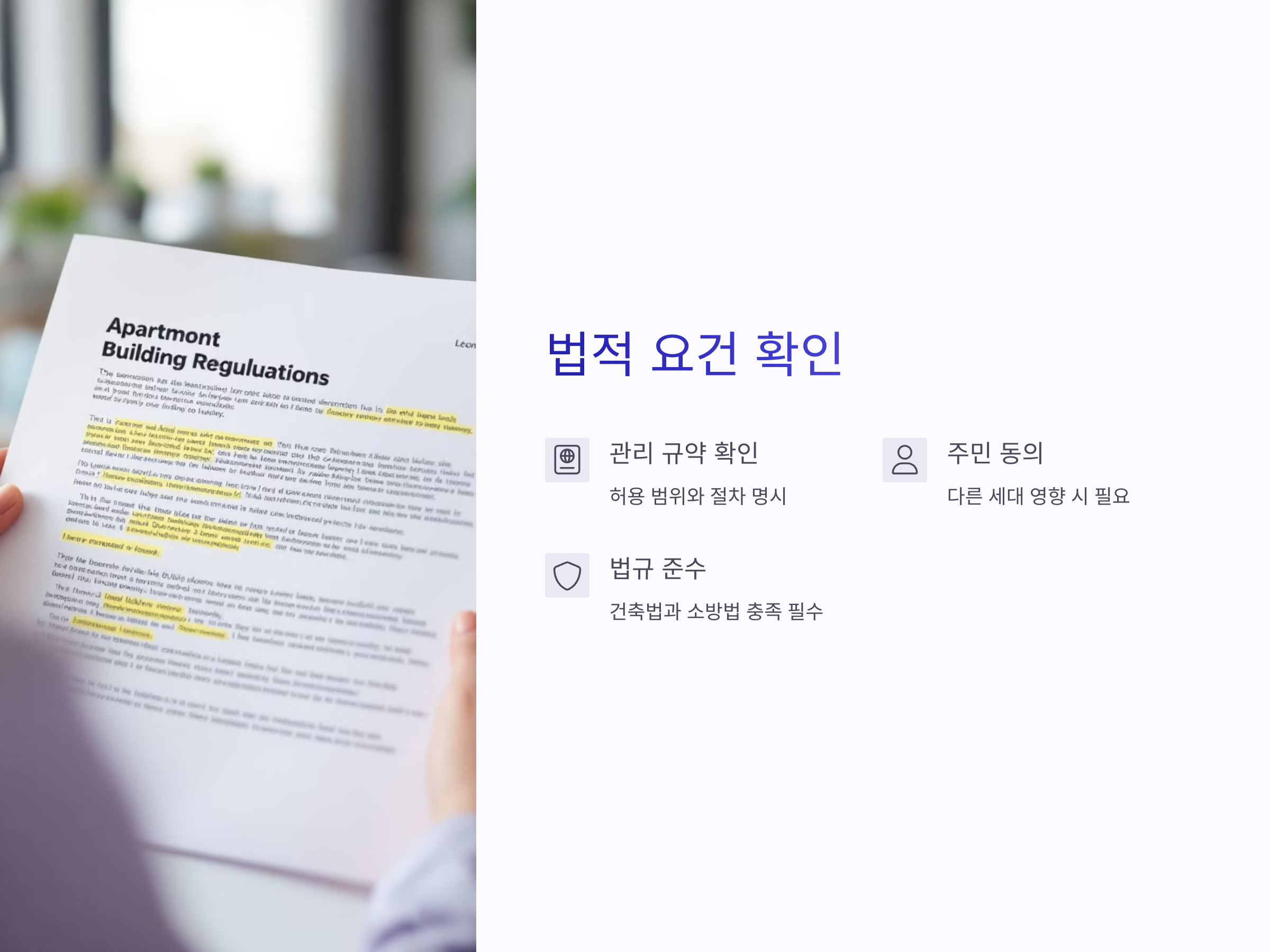 두 번째는 아파트의 관리 규약을 다시 확인하는 것입니다. 변경된 구조가 관리 규약에 맞는지 점검하고, 문제가 있다면 다시 수정해야 할 수 있습니다. 관리 규약은 아파트 내 모든 입주자들이 동의한 규정이므로, 이를 위반하면 법적 분쟁이 발생할 수 있습니다.