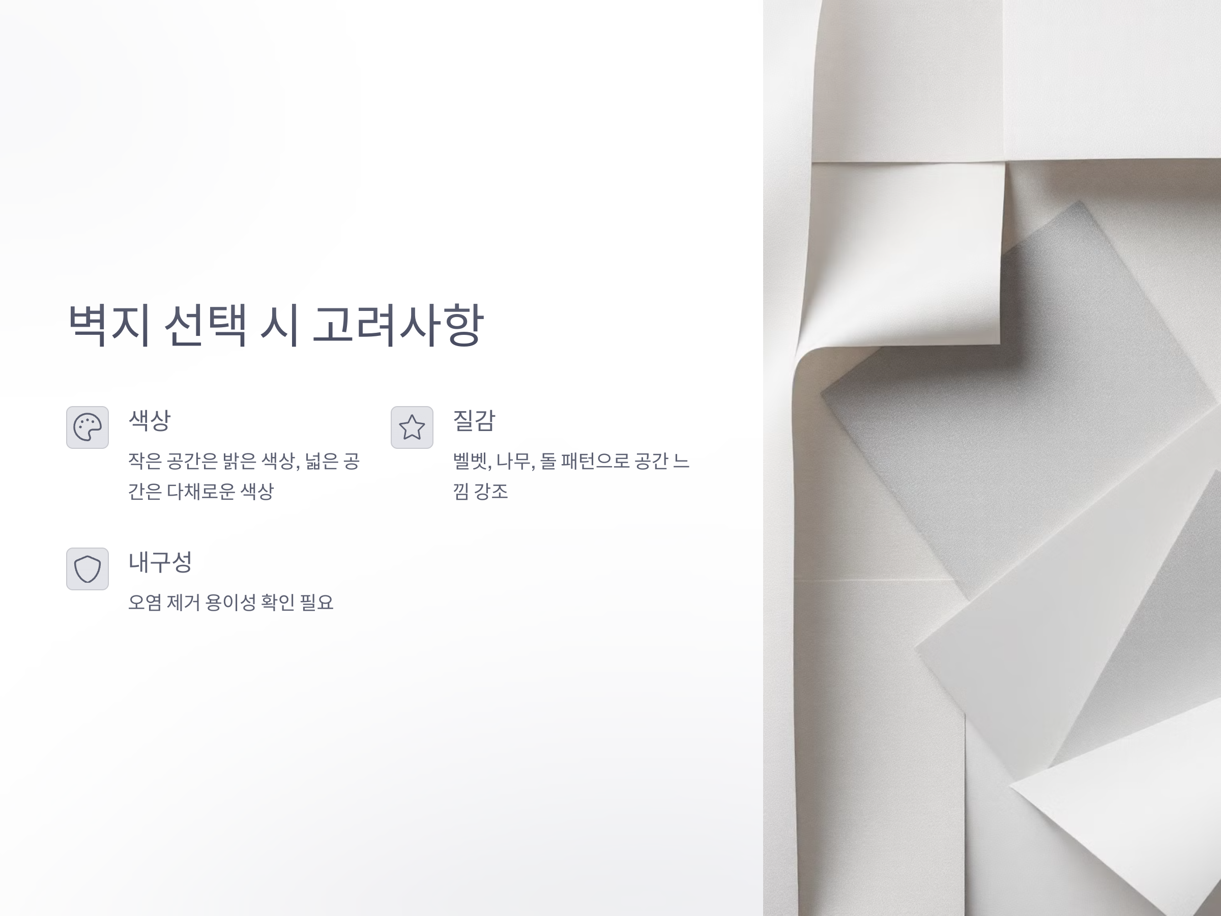 두 번째로 중요한 요소는 질감입니다. 벽지의 질감은 시각적으로도 중요한 요소지만, 실제로 촉감을 통해 공간의 느낌을 더욱 강조할 수 있습니다. 예를 들어, 부드럽고 고급스러운 느낌을 원한다면 벨벳 질감의 벽지를 선택할 수 있으며, 자연적인 분위기를 선호한다면 나무나 돌 패턴의 벽지를 고려해 볼 수 있습니다.
