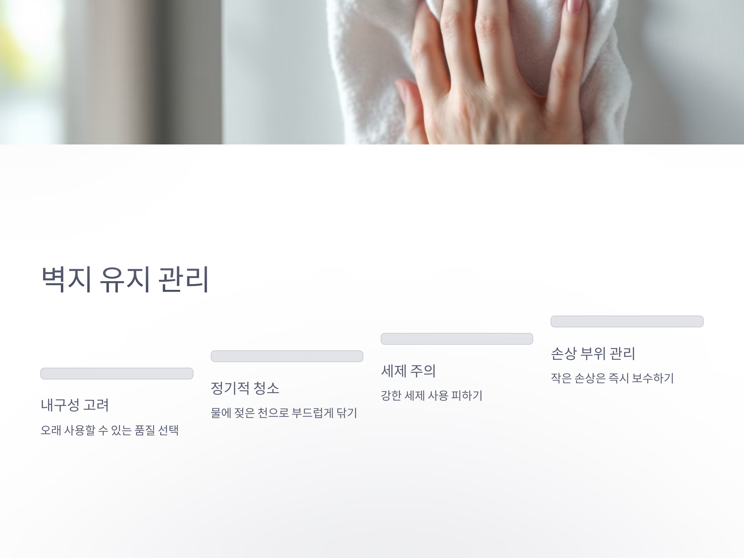 벽지는 한 번 설치하면 오랫동안 사용할 수 있지만, 그 상태를 잘 유지하려면 꾸준한 관리가 필요합니다. 내구성이 강한 벽지를 선택하는 것도 중요하지만, 정기적으로 청소와 관리를 해야 오래도록 좋은 상태를 유지할 수 있습니다. 벽지를 청소할 때는, 물에 젖은 천으로 부드럽게 닦아주고, 강한 세제를 사용하지 않는 것이 좋습니다.