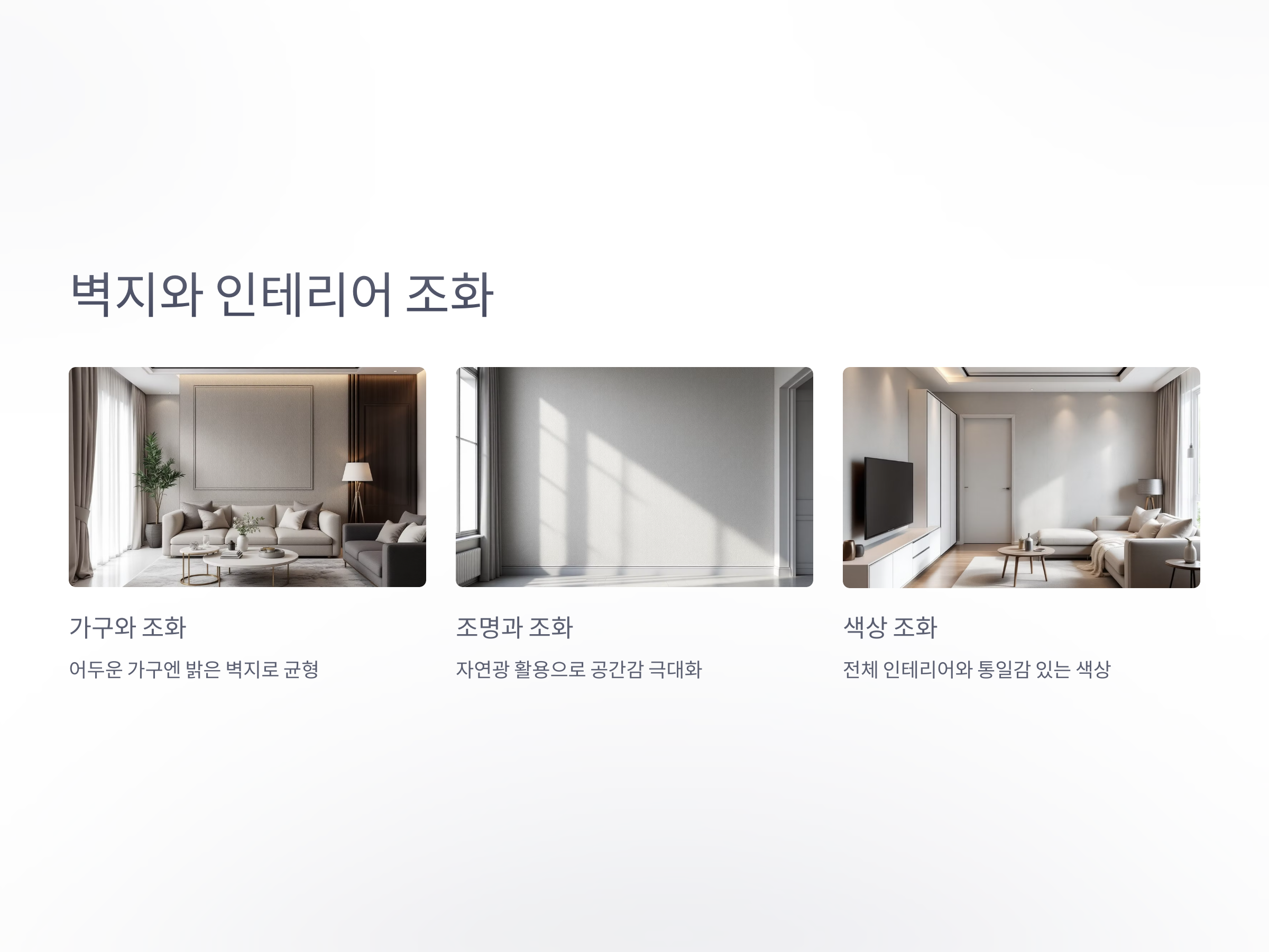 벽지 선택에 있어서 중요한 점 중 하나는 벽지와 가구, 조명과의 조화입니다. 벽지 색상이 너무 튀거나 눈에 띄면 오히려 방이 어수선해 보일 수 있습니다. 가구와의 조화가 중요하며, 예를 들어, 어두운 색의 가구가 많은 공간에서는 벽지를 밝고 따뜻한 색상으로 선택해 균형을 맞추는 것이 좋습니다. 또한, 조명과의 조화도 고려해야 합니다. 벽지가 너무 어두운 색일 경우, 조명이 너무 강하면 공간이 더 답답해 보일 수 있으므로, 자연광을 최대한 활용하는 것이 중요합니다.