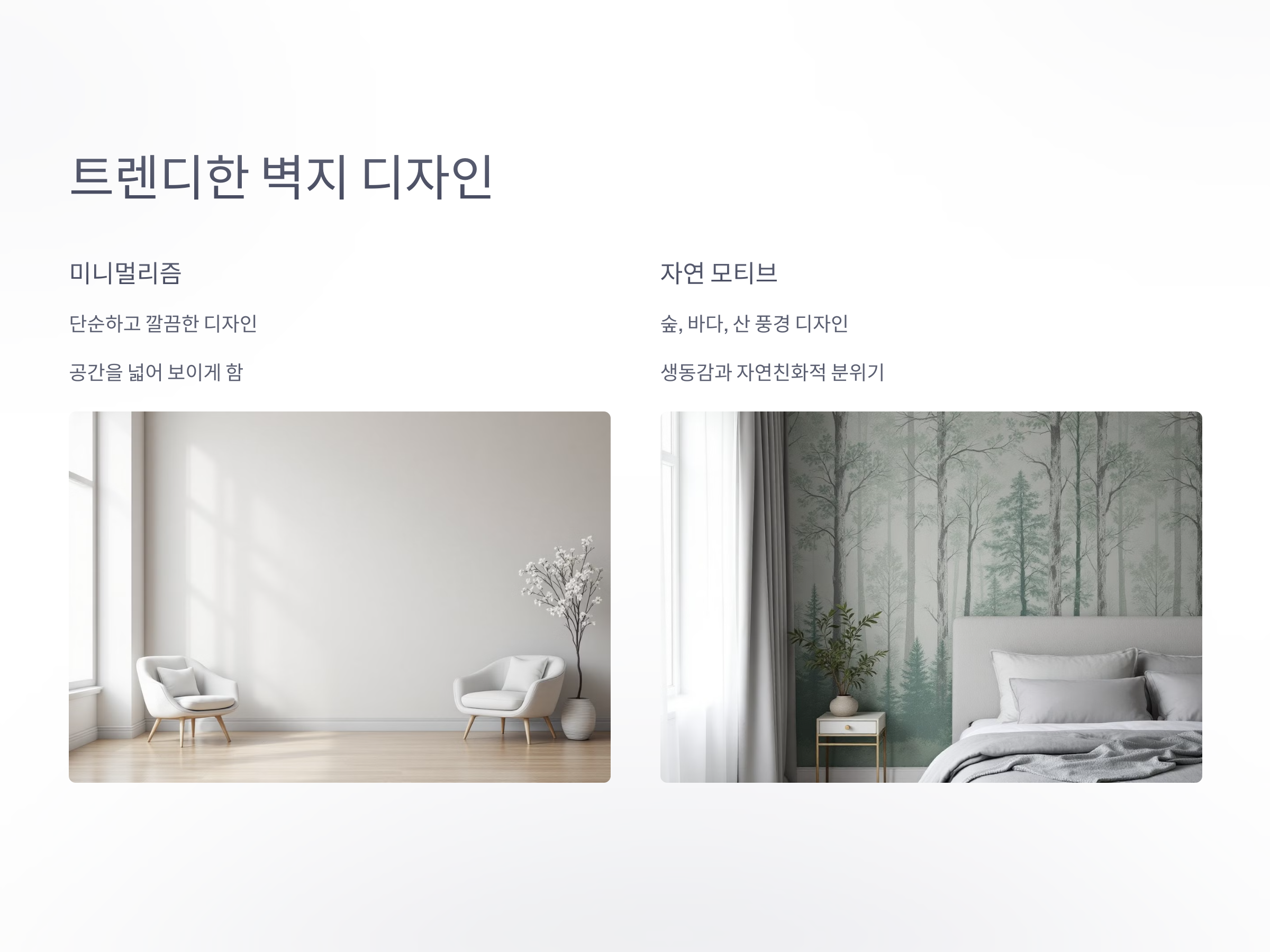 또한, 자연을 모티브로 한 디자인도 최근에 많은 사람들이 선택하고 있습니다. 자연에서 영감을 받은 벽지, 예를 들어, 숲속의 나무, 바다의 파도, 혹은 산의 풍경을 담은 벽지는 공간에 생동감을 주고, 자연 친화적인 분위기를 만들어냅니다. 특히, 홈 오피스나 침실처럼 휴식과 집중이 필요한 공간에서 유용하게 활용될 수 있습니다.