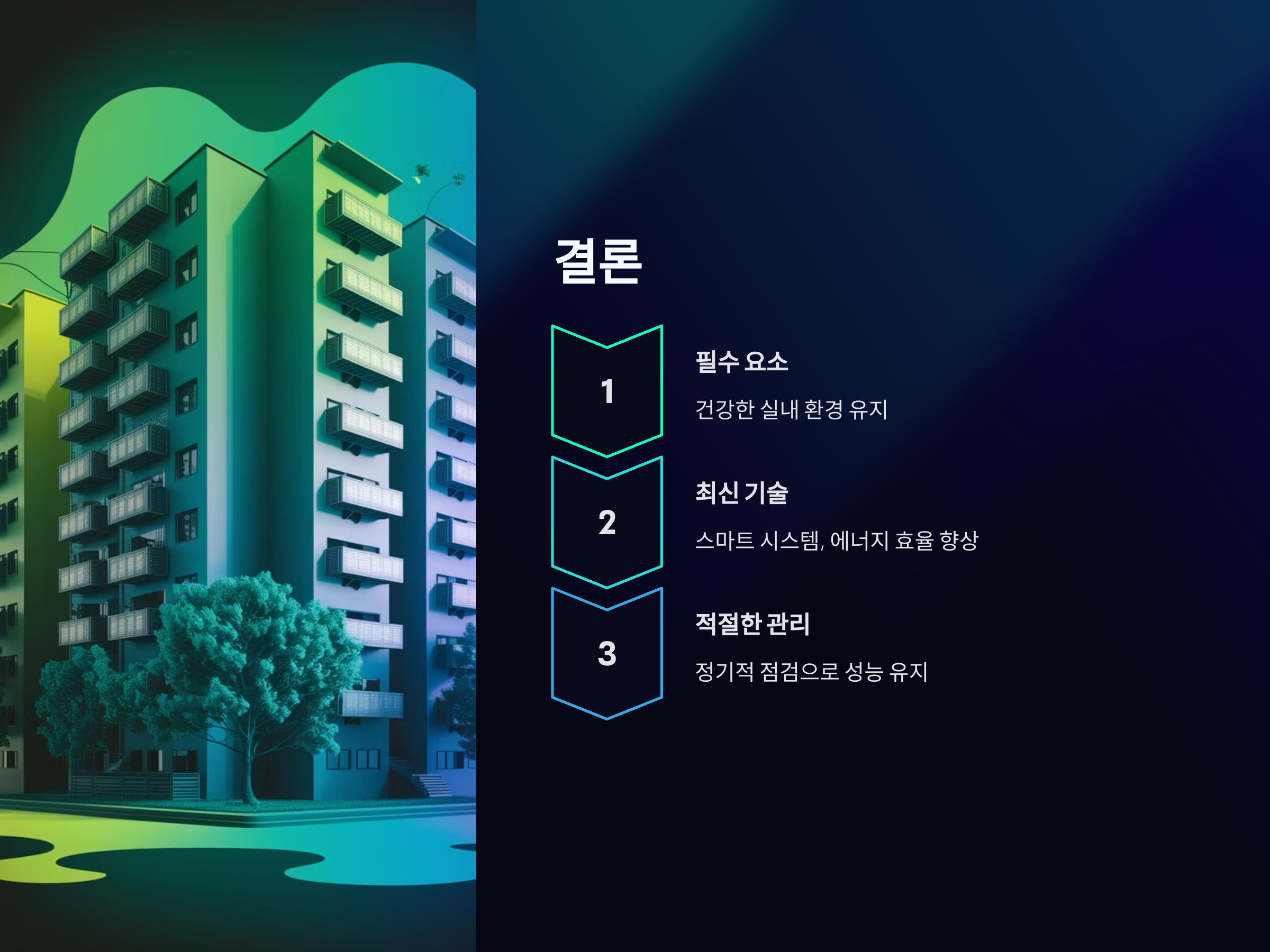 아파트 내부 환기 시스템은 이제 더 이상 선택이 아닌 필수입니다. 건강한 공기 질을 유지하려면 적절한 환기 시스템이 필요하며, 최신 기술을 적용하면 더욱 효율적인 관리가 가능합니다. 아파트에 거주하는 분들은 환기 시스템을 점검하고, 필요한 시스템을 설치해 더욱 쾌적하고 건강한 생활을 누리시길 바랍니다.