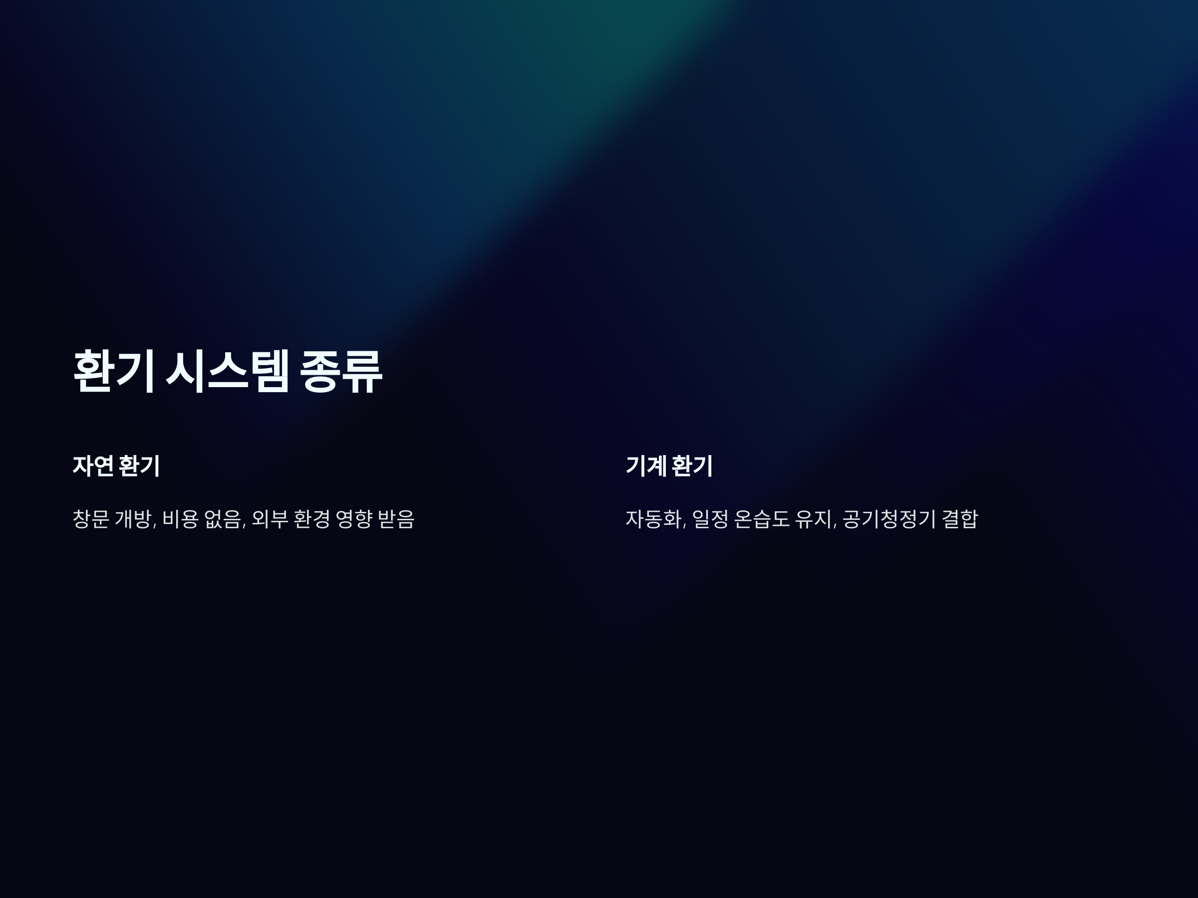 아파트의 내부 환기 시스템은 크게 두 가지로 나눌 수 있습니다: 자연 환기와 기계 환기. 각 시스템의 특징과 장단점을 살펴보겠습니다.