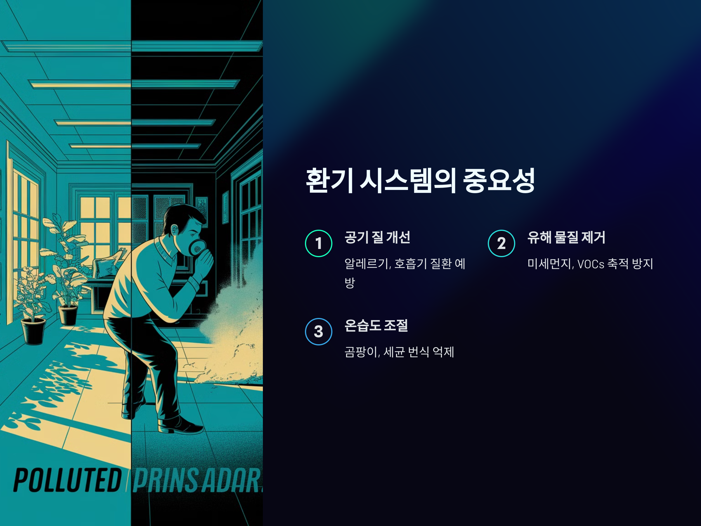 아파트에서 환기 시스템이 중요한 이유는 첫 번째로 공기 질과 관련이 있습니다. 밀폐된 공간에서 살다 보면 자연스럽게 실내 공기가 오염될 수 있습니다. 오염된 공기는 알레르기, 호흡기 질환, 두통 등 다양한 건강 문제를 일으킬 수 있습니다. 특히 미세먼지, 이산화탄소, 휘발성 유기화합물(VOCs) 등의 유해 물질이 실내에 축적되면, 사람들에게 직접적인 영향을 미칠 수 있습니다.
