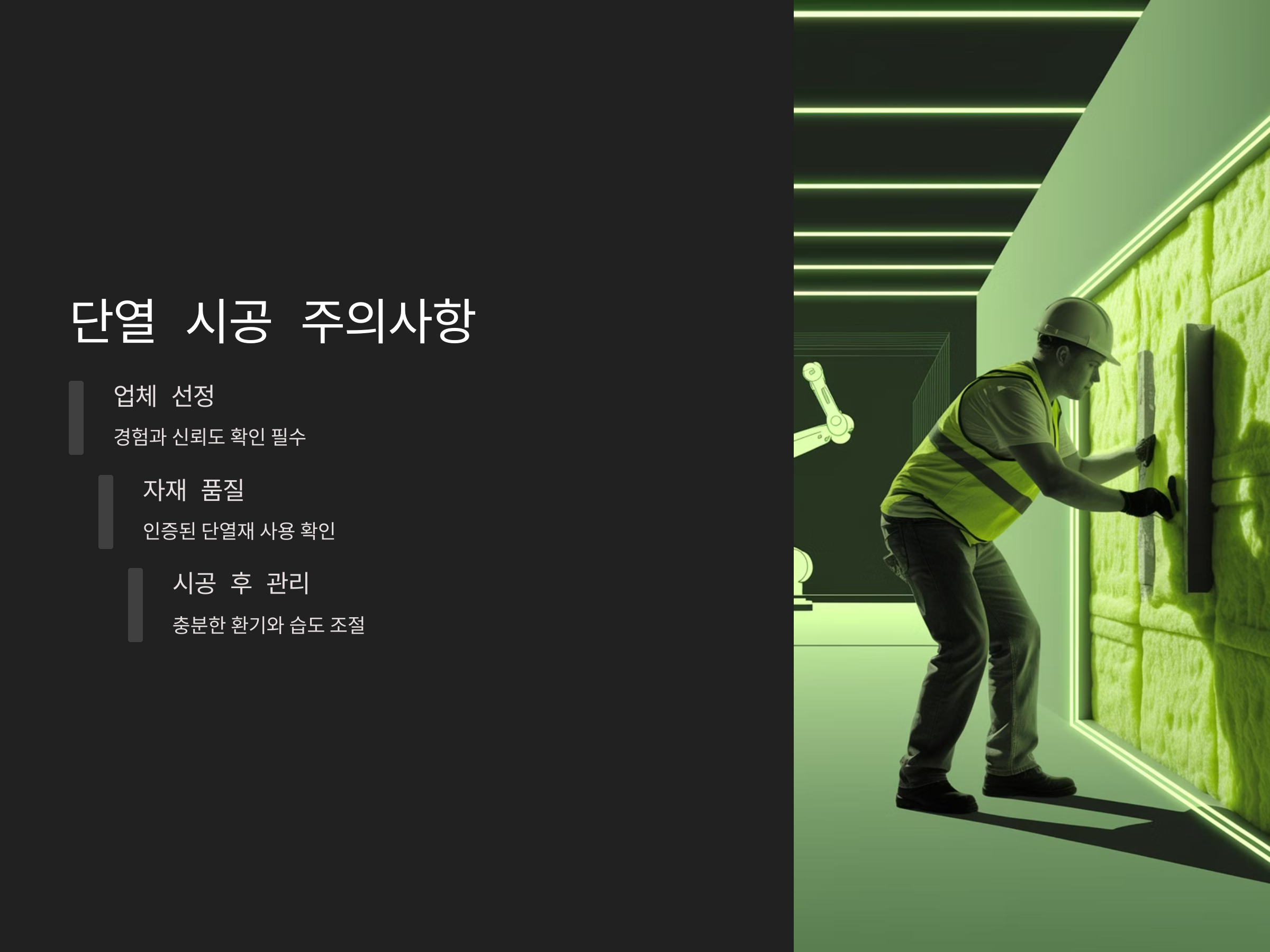 단열 시공을 진행할 때는 시공업체의 경험과 신뢰도를 확인하는 것이 중요합니다. 잘못된 시공은 오히려 단열 효과를 떨어뜨리고 문제를 일으킬 수 있습니다. 또한, 시공 후에는 결로 방지를 위해 충분한 환기와 적절한 습도 관리를 해야 합니다.