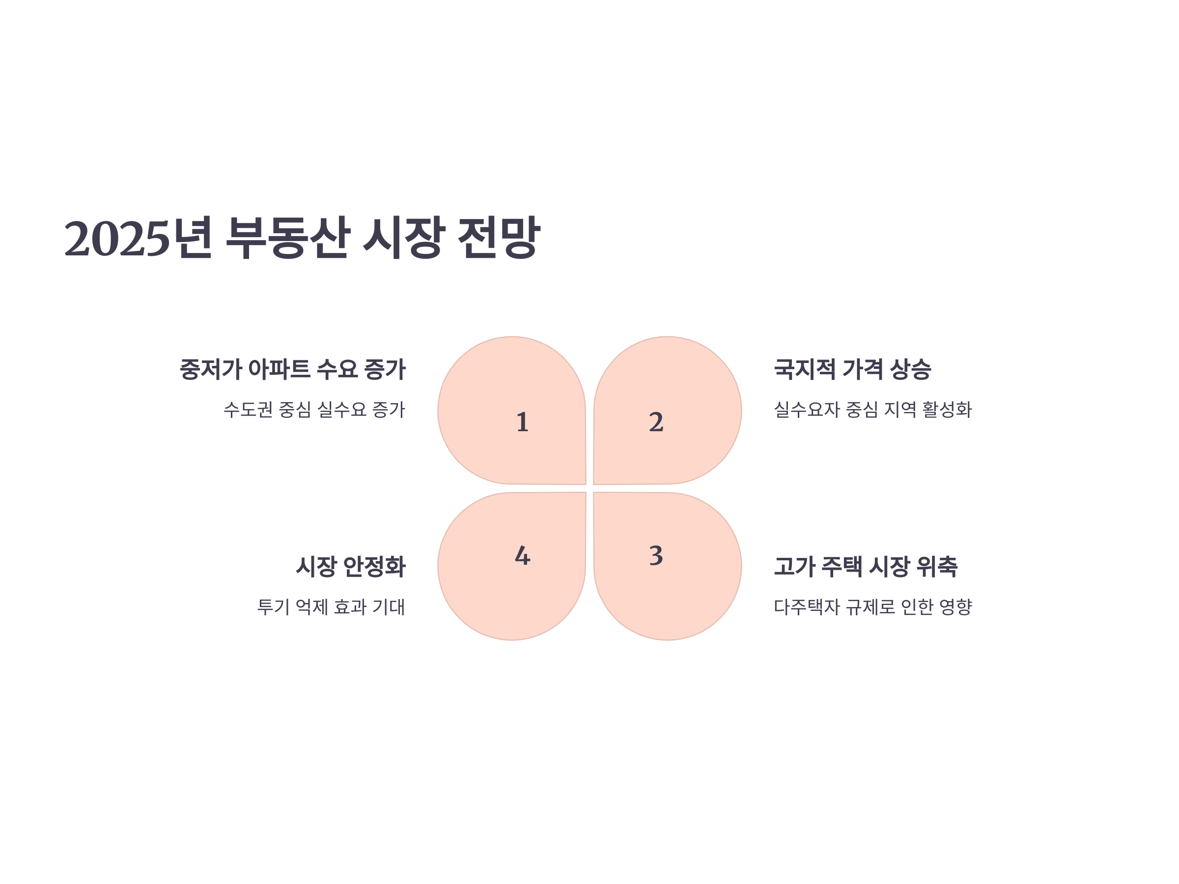2025년 아파트 대출 규제 변화는 부동산 시장에 복합적인 영향을 줄 것으로 보입니다. 전문가들은 실수요자 중심의 완화 정책으로 인해 수도권을 중심으로 중저가 아파트 수요가 증가할 것으로 전망하고 있으며, 이에 따른 국지적 가격 상승 가능성도 언급하고 있습니다.
