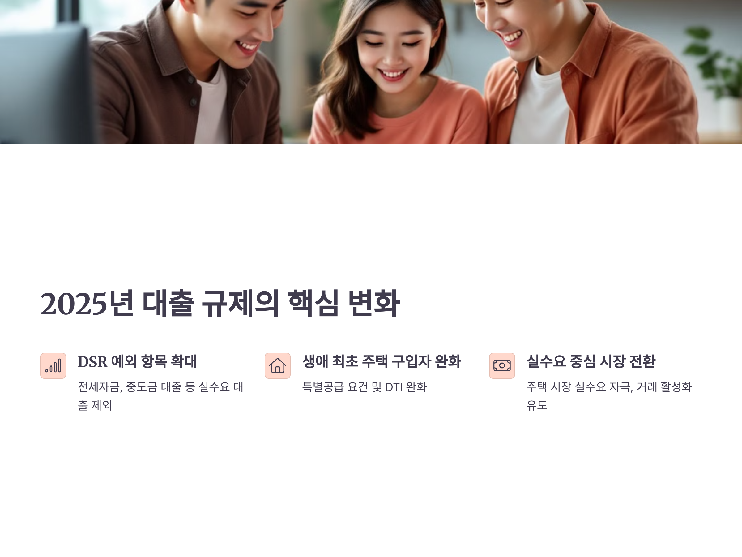 2025년부터 시행되는 아파트 대출 규제의 가장 큰 변화는 'DSR 예외 항목 확대'와 '생애 최초 주택 구입자 완화 정책'입니다. 이전까지는 모든 대출이 DSR에 포함되어 연 소득 대비 대출 한도가 제한되었으나, 이제는 전세자금 대출, 중도금 대출 등 실수요 대출은 일정 기준 하에 제외되면서 더욱 유연한 대출이 가능해졌습니다.