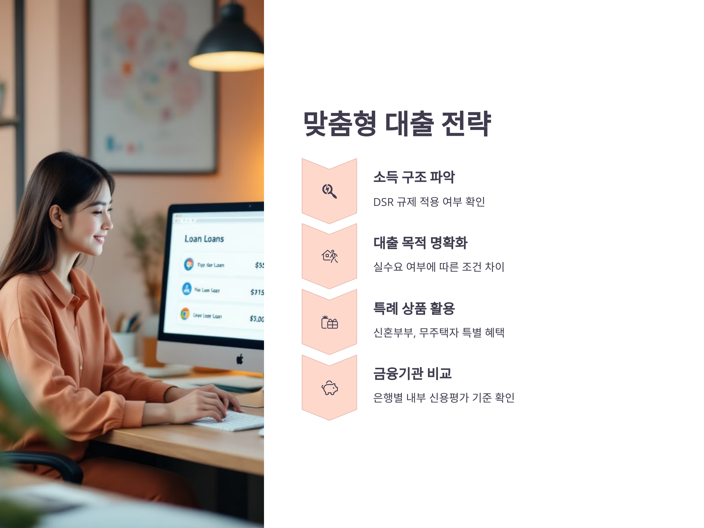 바뀐 대출 규제 속에서는 맞춤형 대출 전략 수립이 매우 중요합니다. 첫째, 소득 구조에 따라 DSR 규제 적용 여부를 철저히 파악해야 하며, 둘째로는 대출 목적이 실수요인지 여부에 따라 전혀 다른 대출 한도와 조건이 적용됩니다. 특히 신혼부부나 무주택 실수요자의 경우 다양한 특례 상품을 적극적으로 활용할 수 있는 기회를 놓치지 말아야 합니다.