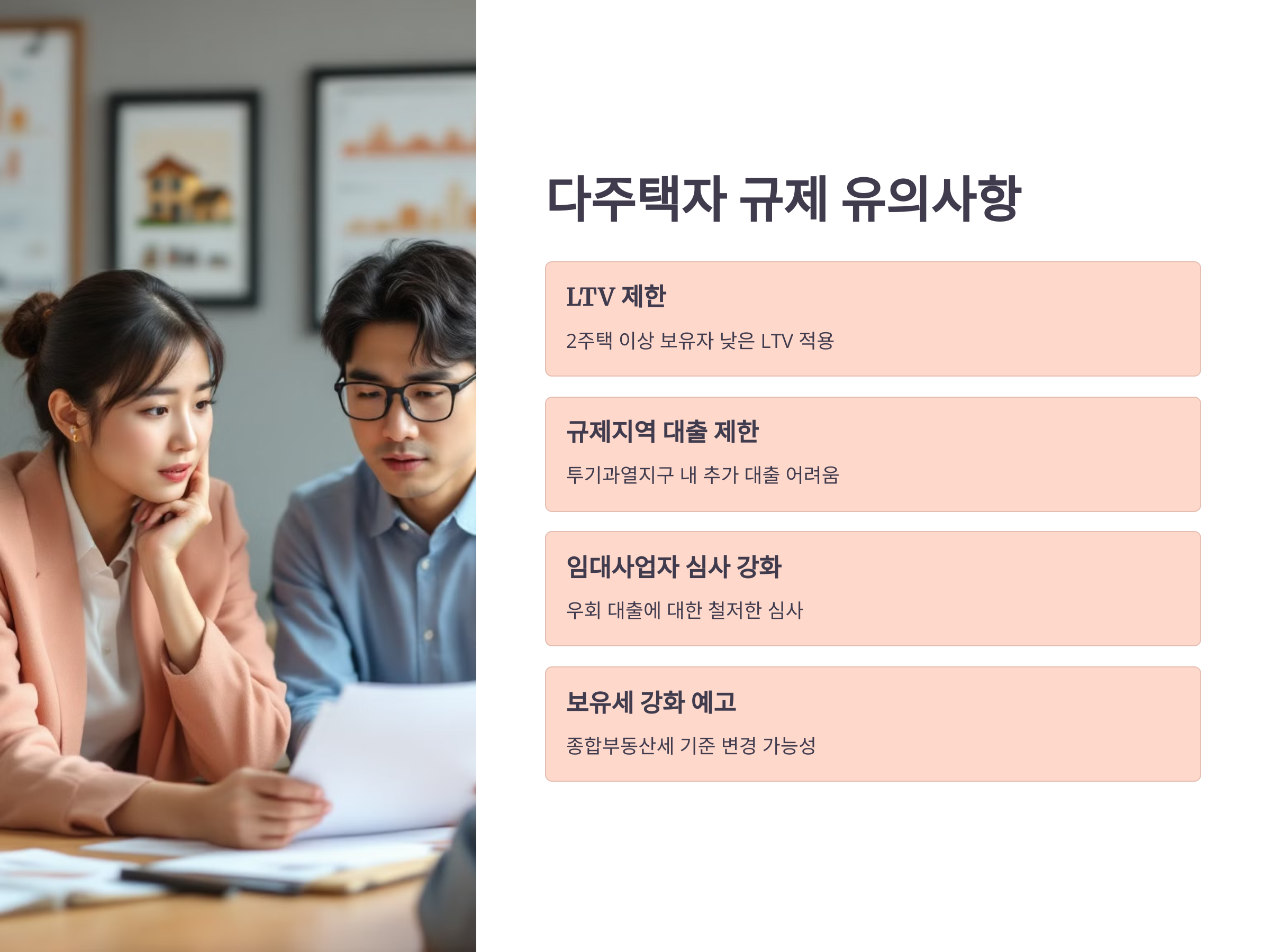 한편, 다주택자에 대한 대출 규제는 여전히 강하게 유지되고 있습니다. 2주택 이상 보유자의 경우 LTV가 낮게 책정되며, 규제지역 내에서는 주택담보대출이 사실상 어렵습니다. 또한 조정지역 및 투기과열지구 내 주택에 대해선 추가 대출이 제한되거나 높은 금리 적용 등의 불이익이 존재합니다.