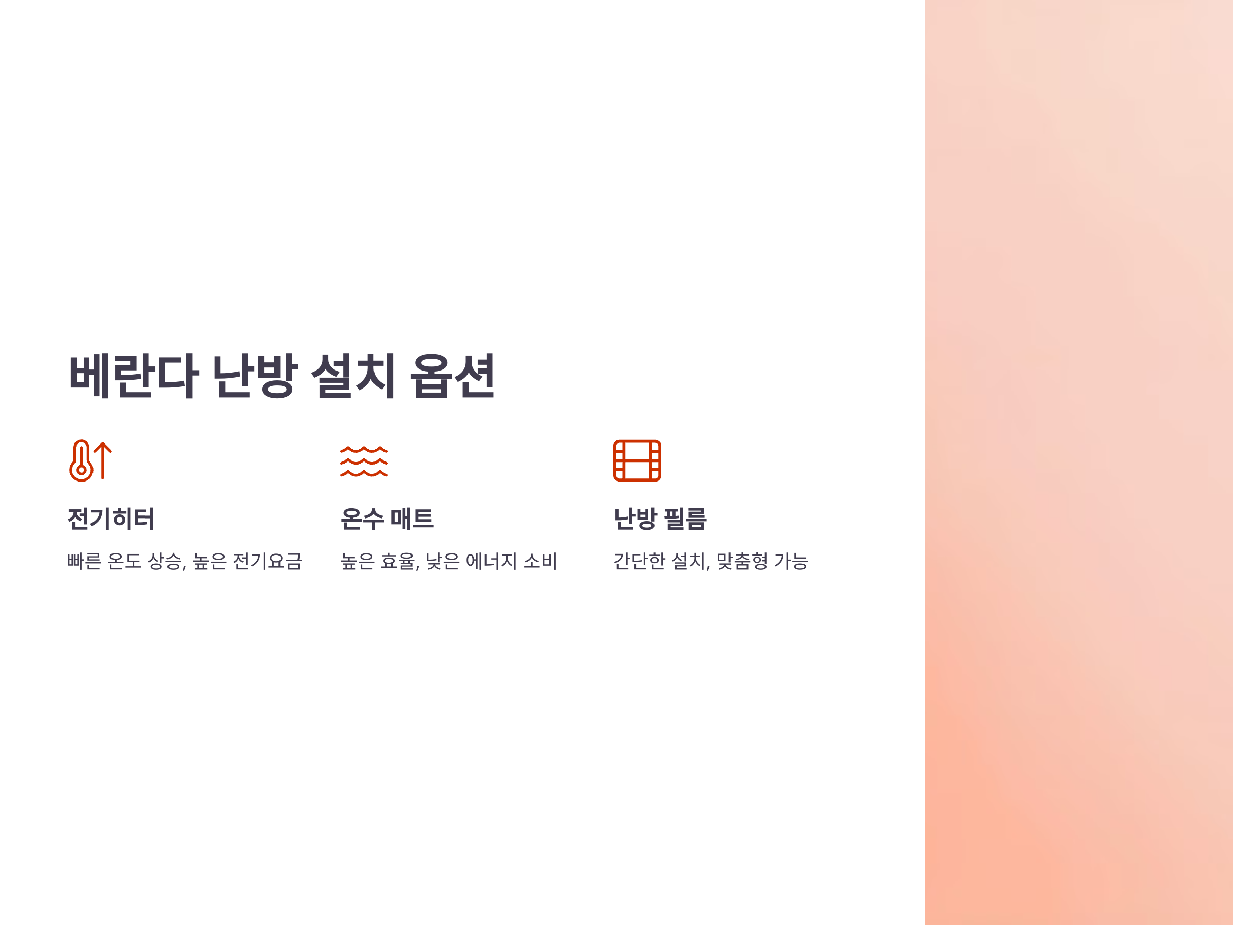 온수 매트는 배관을 통해 뜨거운 물을 순환시켜 베란다를 따뜻하게 만드는 방식입니다. 설치가 다소 번거롭지만, 난방효율이 높고, 장기적으로 에너지 소비가 적은 편입니다. 온수 매트는 겨울철 난방비를 절감하고 싶은 분들에게 유리한 선택이 될 수 있습니다.