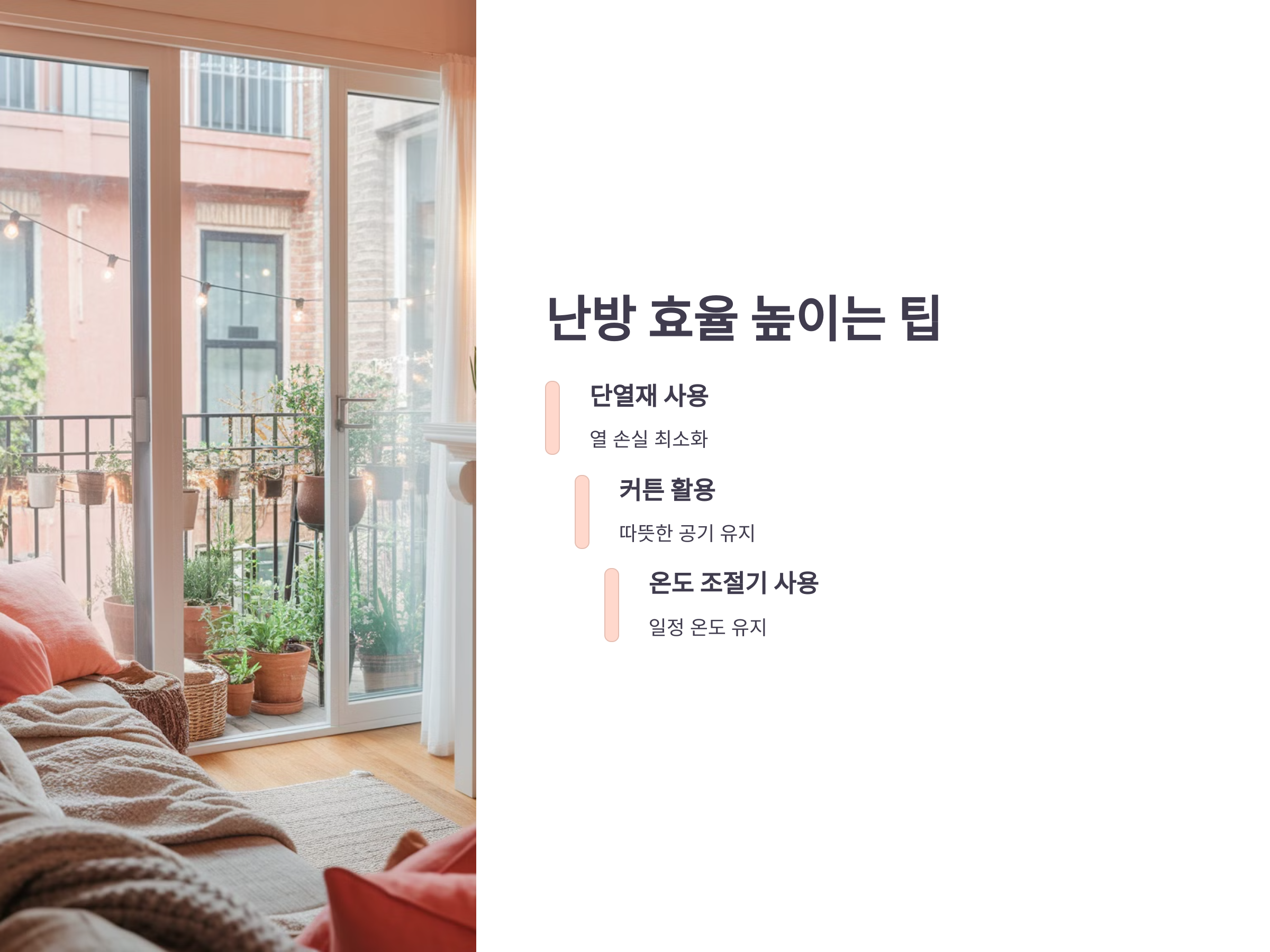 아파트 베란다 난방은 겨울철 난방비 절감뿐만 아니라, 실내 온도를 일정하게 유지하는 데 매우 효과적인 방법입니다. 다양한 난방 방법 중 자신의 집 구조와 필요에 맞는 방식을 선택하면, 더욱 효율적으로 베란다 난방을 활용할 수 있습니다. 난방비를 아끼면서도 따뜻하고 아늑한 겨울을 보내고 싶다면, 베란다 난방을 고려해보세요.