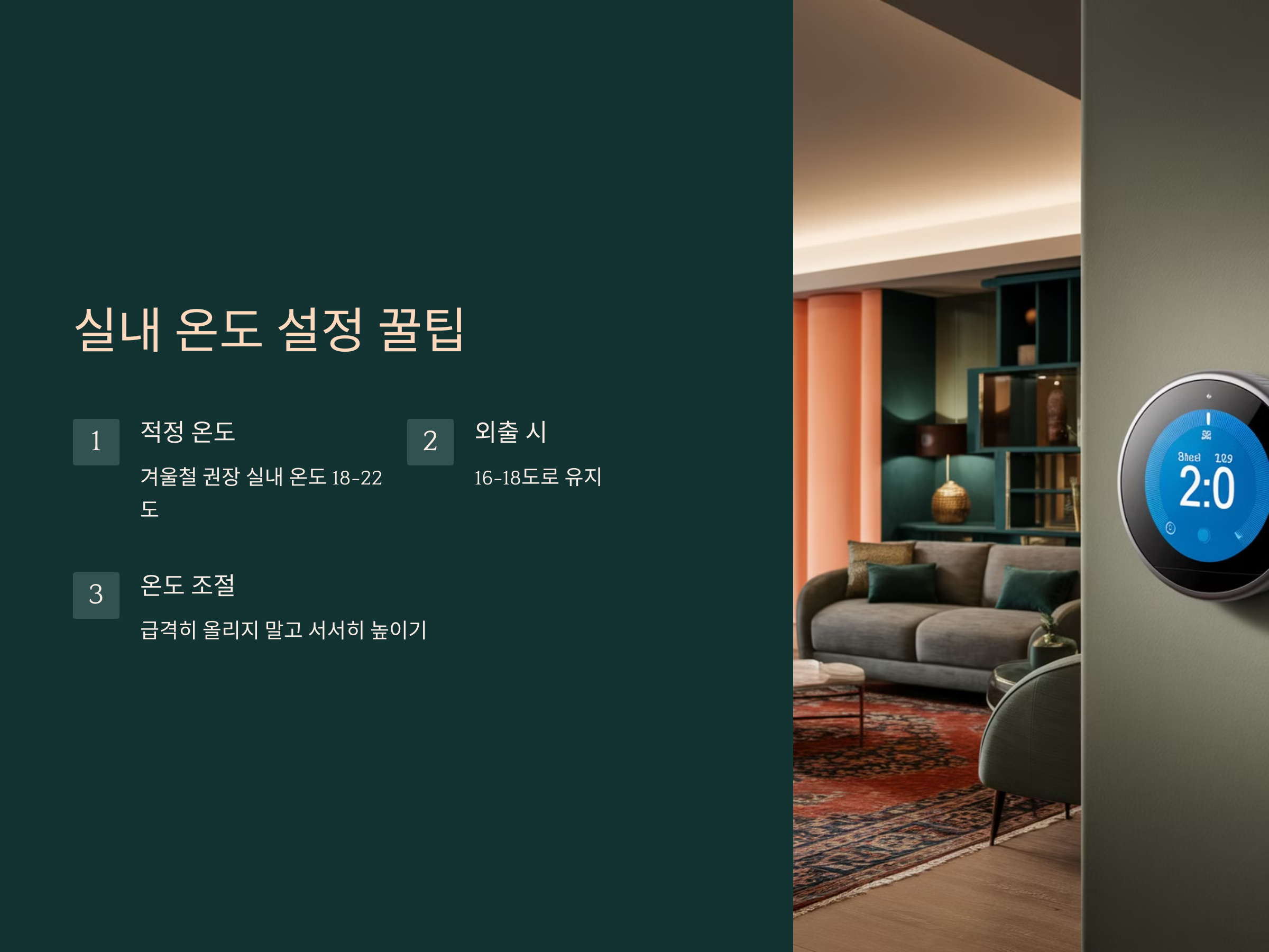 보일러를 사용할 때 가장 중요한 것은 적절한 실내 온도를 유지하는 것입니다. 겨울철 권장 실내 온도는 18~22도 사이이며, 너무 높게 설정하면 난방비가 급증할 수 있습니다. 특히, 외출할 때 온도를 너무 낮추면 보일러가 다시 가동될 때 더 많은 에너지를 사용하므로 16~18도 정도로 유지하는 것이 좋습니다.