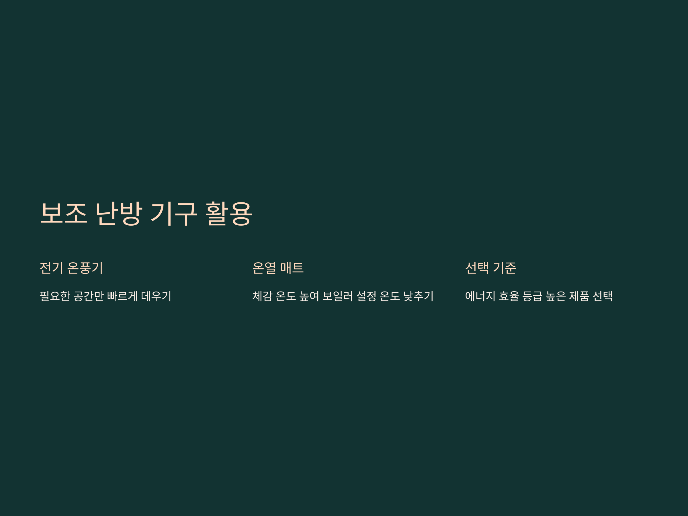 보일러만으로 난방을 하다 보면 가스비 부담이 커질 수 있습니다. 이를 보완하기 위해 전기 온풍기나 온열 매트 같은 보조 난방 기구를 함께 사용하면 효과적입니다. 특히, 거실이나 방의 크기에 따라 적절한 기기를 선택하는 것이 중요합니다.