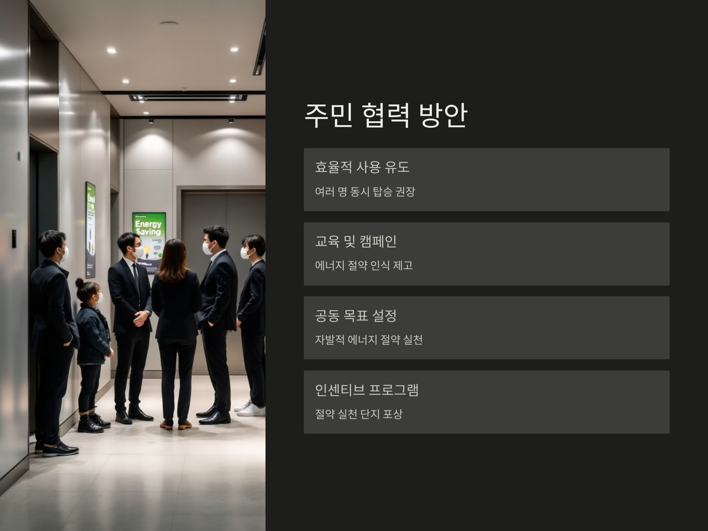 엘리베이터 관리비 절감은 관리자뿐만 아니라 아파트 주민들의 협력도 중요합니다. 주민들이 엘리베이터를 효율적으로 사용하는 것도 관리비 절감에 기여할 수 있습니다. 예를 들어, 승객들이 엘리베이터를 사용할 때 여러 명이 동시에 탑승하도록 유도하거나, 불필요하게 여러 층을 오가는 것을 줄이는 등의 행동을 유도할 수 있습니다. 이를 위해 아파트 내에서 주민들에게 에너지 절약에 대한 교육과 캠페인을 진행할 수 있습니다.