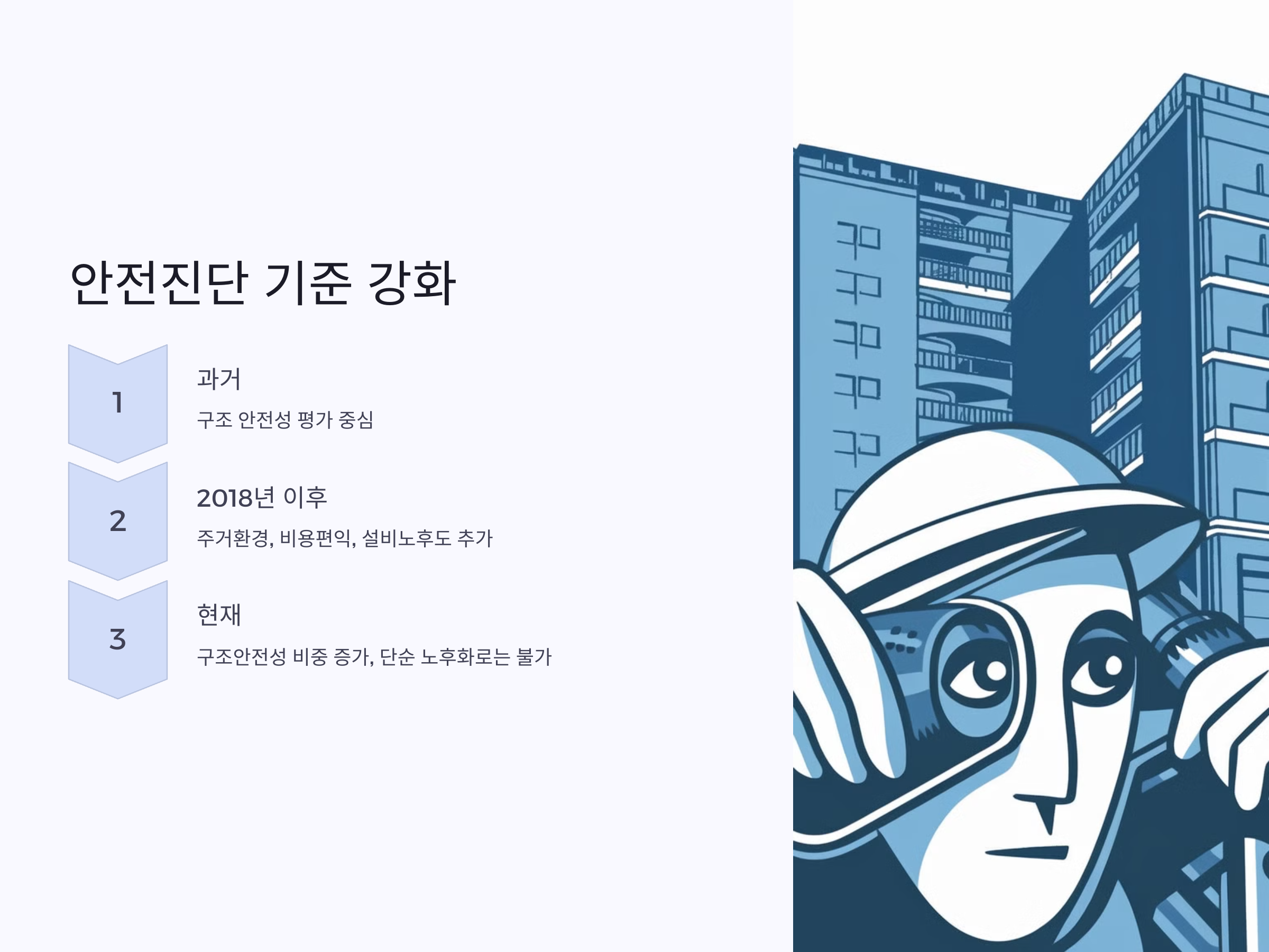 재건축을 추진하기 위해서는 안전진단을 통과해야 합니다. 과거에는 구조 안전성 평가가 주를 이루었지만, 2018년 이후로는 주거 환경, 비용 편익, 설비 노후도 등 다양한 항목이 추가되어 기준이 강화되었습니다. 특히, 구조 안전성의 비중이 높아져 단순한 노후화만으로는 재건축이 어려워졌습니다. 이러한 변화로 인해 재건축을 계획하는 단지들은 안전진단 통과에 많은 어려움을 겪고 있습니다.