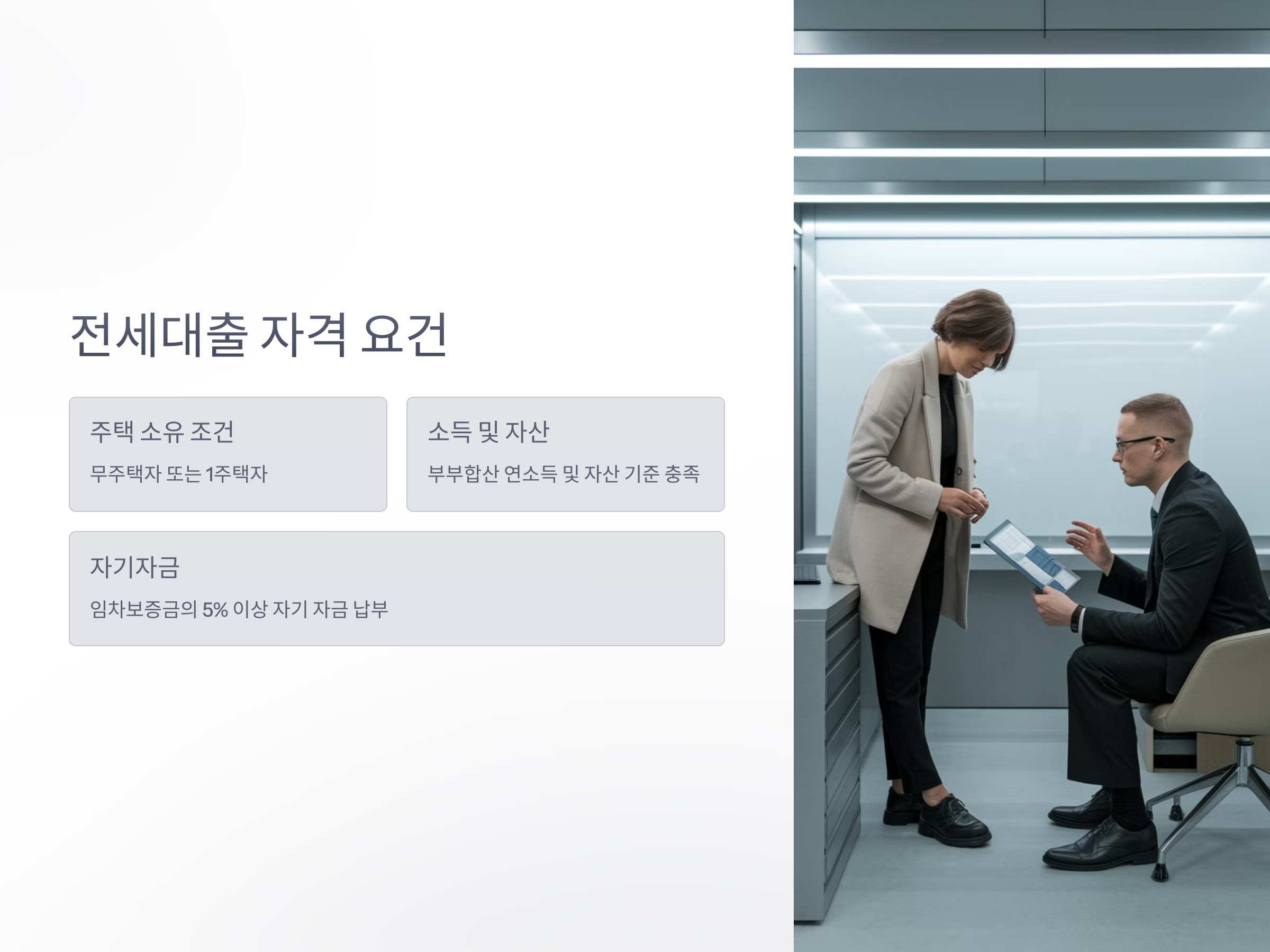 전세대출을 받기 위해서는 몇 가지 자격 요건을 충족해야 합니다. 먼저, 무주택자 또는 1주택자여야 하며, 부부합산 연소득 및 자산 기준을 만족해야 합니다. 또한 임차보증금의 5% 이상을 자기 자금으로 납부해야 합니다. 이러한 요건들을 꼼꼼히 확인하는 것이 중요합니다. citeturn0search1