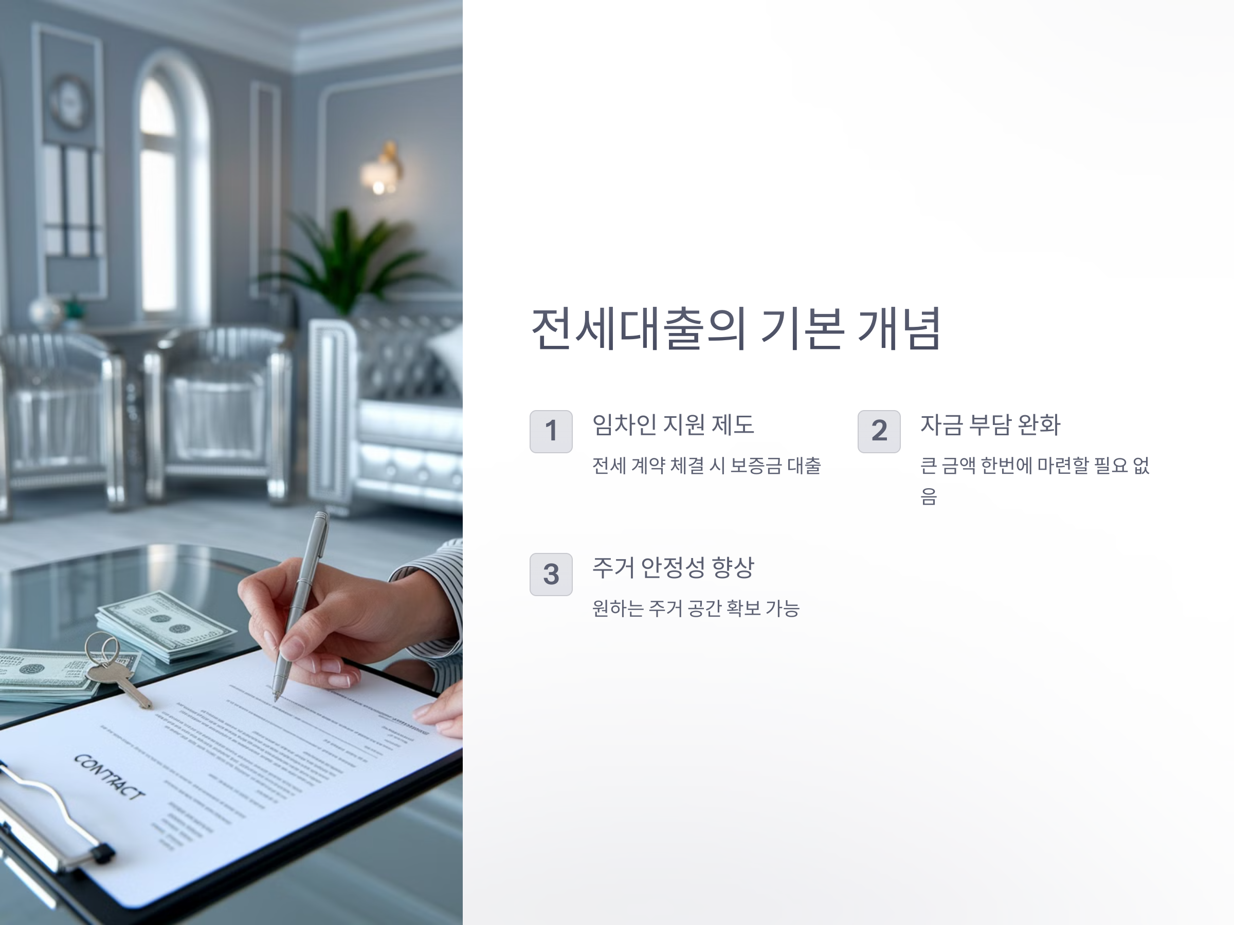 전세대출은 임차인이 전세 계약을 체결할 때 필요한 보증금을 금융기관에서 대출받는 제도입니다. 이를 통해 임차인은 큰 금액의 보증금을 한 번에 마련하지 않고도 원하는 주거 공간에 거주할 수 있게 됩니다. 특히 자금이 부족한 임차인들에게 유용하며, 주거 안정성을 높이는 데 기여합니다.