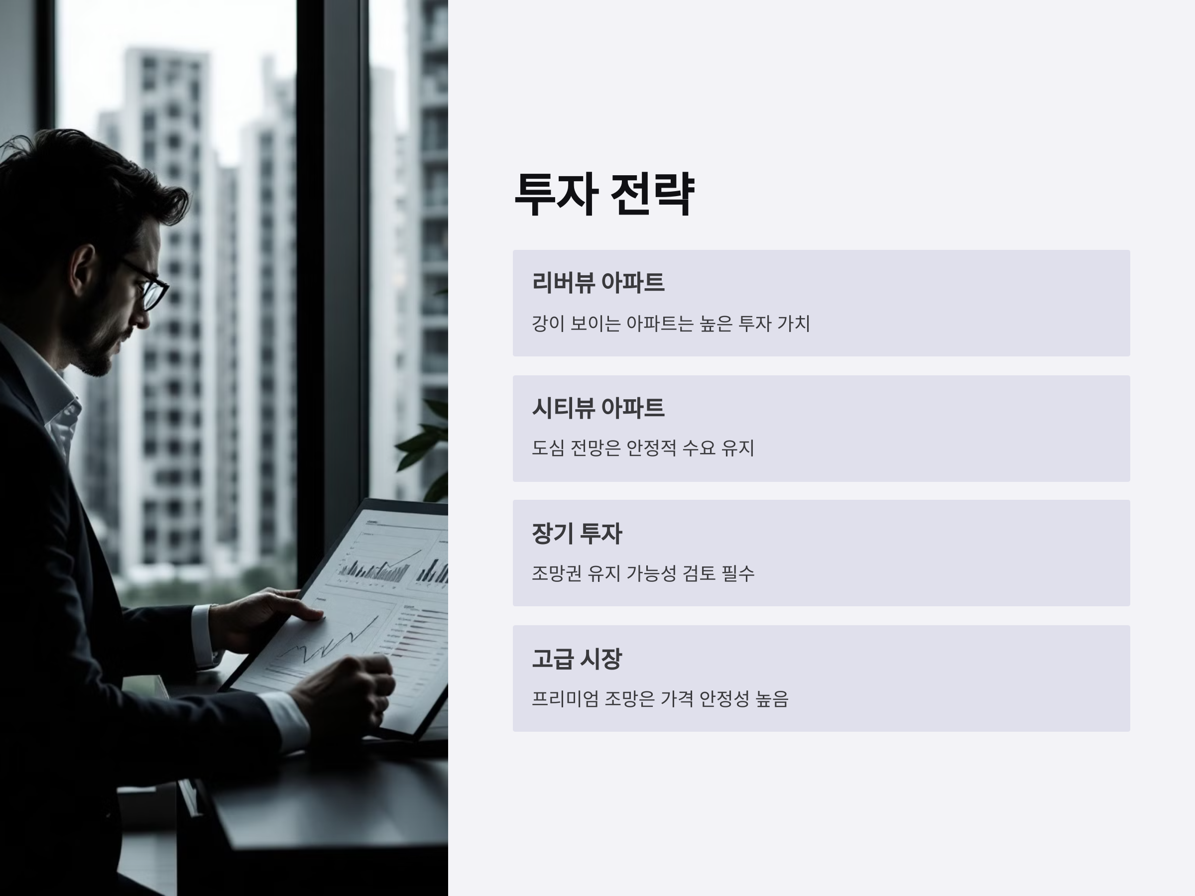 아파트를 투자 대상으로 고려할 때, 조망권을 중요한 판단 기준으로 삼는 것이 중요합니다. 특히 리버뷰 아파트나 시티뷰 아파트는 일반적으로 높은 투자 가치를 지니며, 가격 상승의 가능성도 큽니다. 또한, 주변 환경에 따라 조망권이 변화할 수 있으므로, 장기적인 투자 계획을 세울 때에는 이 점을 충분히 고려해야 합니다.