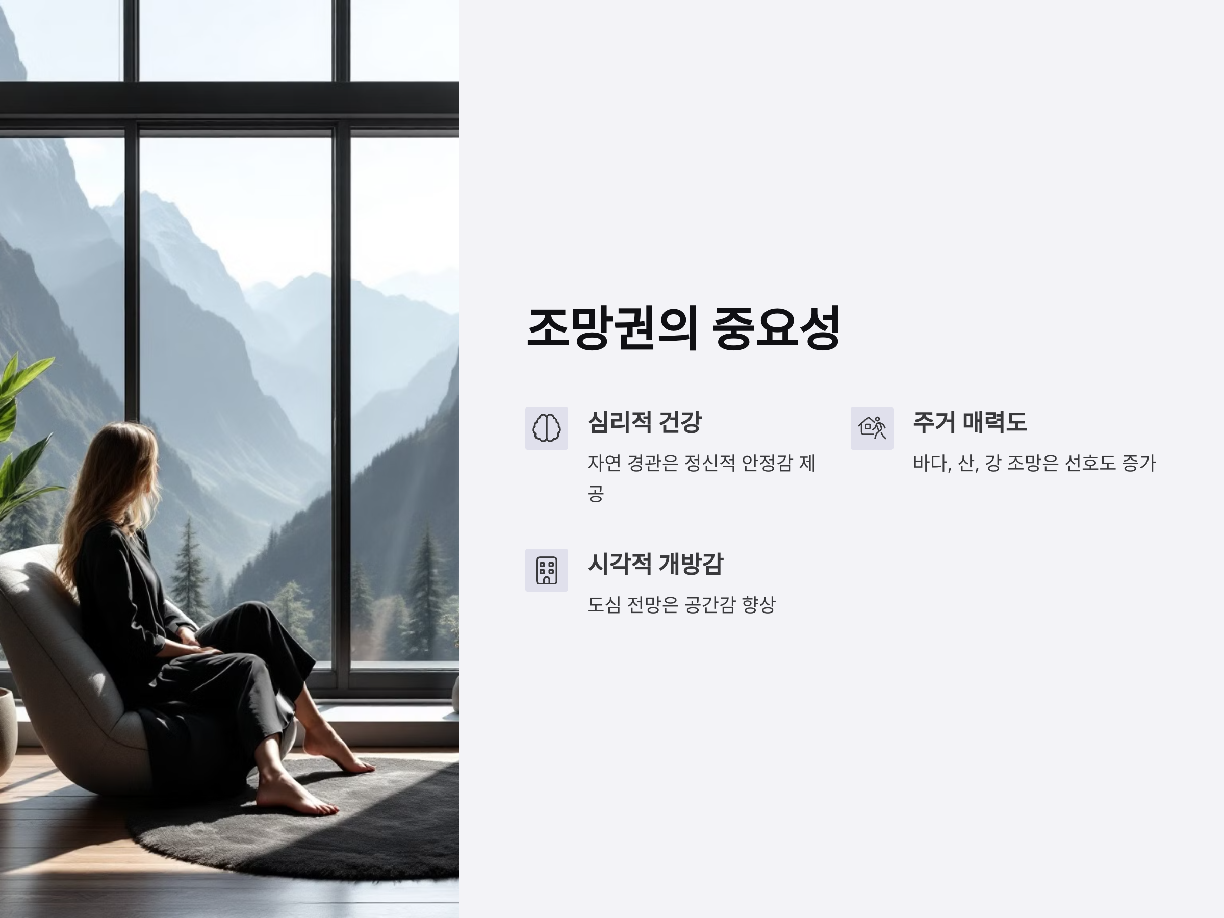 조망권의 중요성은 단순히 경치가 좋다는 이유만으로 평가되는 것이 아닙니다. 아파트에서 바라보는 경관은 거주자의 심리적, 신체적 건강에 긍정적인 영향을 미칠 수 있습니다. 특히 도시 속에서 자연을 가까이 두고 생활할 수 있다는 점은 정신적인 안정감을 주며, 이는 주거지 선택에 있어 큰 매력으로 작용합니다.