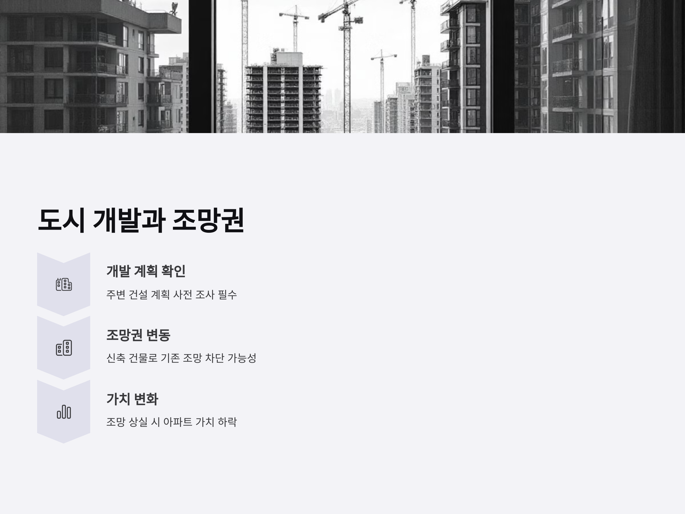 도시 개발이 이루어지는 지역에서는 조망권의 가치가 급격히 변동할 수 있습니다. 예를 들어, 한때 바다를 볼 수 있었던 아파트가 새로운 건물들이 들어서면서 바다를 보지 못하게 되는 경우, 그 아파트의 가치는 떨어질 수 있습니다. 이는 개발이 이루어지는 지역에서 종종 발생하는 일입니다. 조망권은 단기적인 시장 동향뿐 아니라, 장기적인 도시 개발 계획에 영향을 받기 때문에, 이를 잘 분석하는 것이 중요합니다.