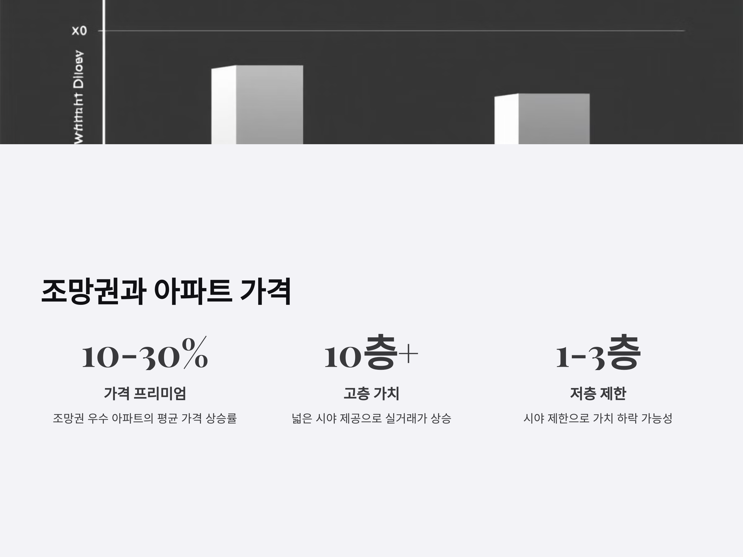 조망권은 아파트의 시장 가격에 직결되는 중요한 요소입니다. 일반적으로 조망권이 좋은 아파트는 그렇지 않은 아파트에 비해 평균적으로 10%에서 30% 더 높은 가격을 형성하는 경우가 많습니다. 특히, 도심에서 멀리 떨어져 있는 고급 아파트들이나 리버뷰, 시티뷰를 갖춘 아파트들은 가격 상승폭이 더욱 크며, 이는 수요와 공급의 법칙과도 밀접한 관계가 있습니다.