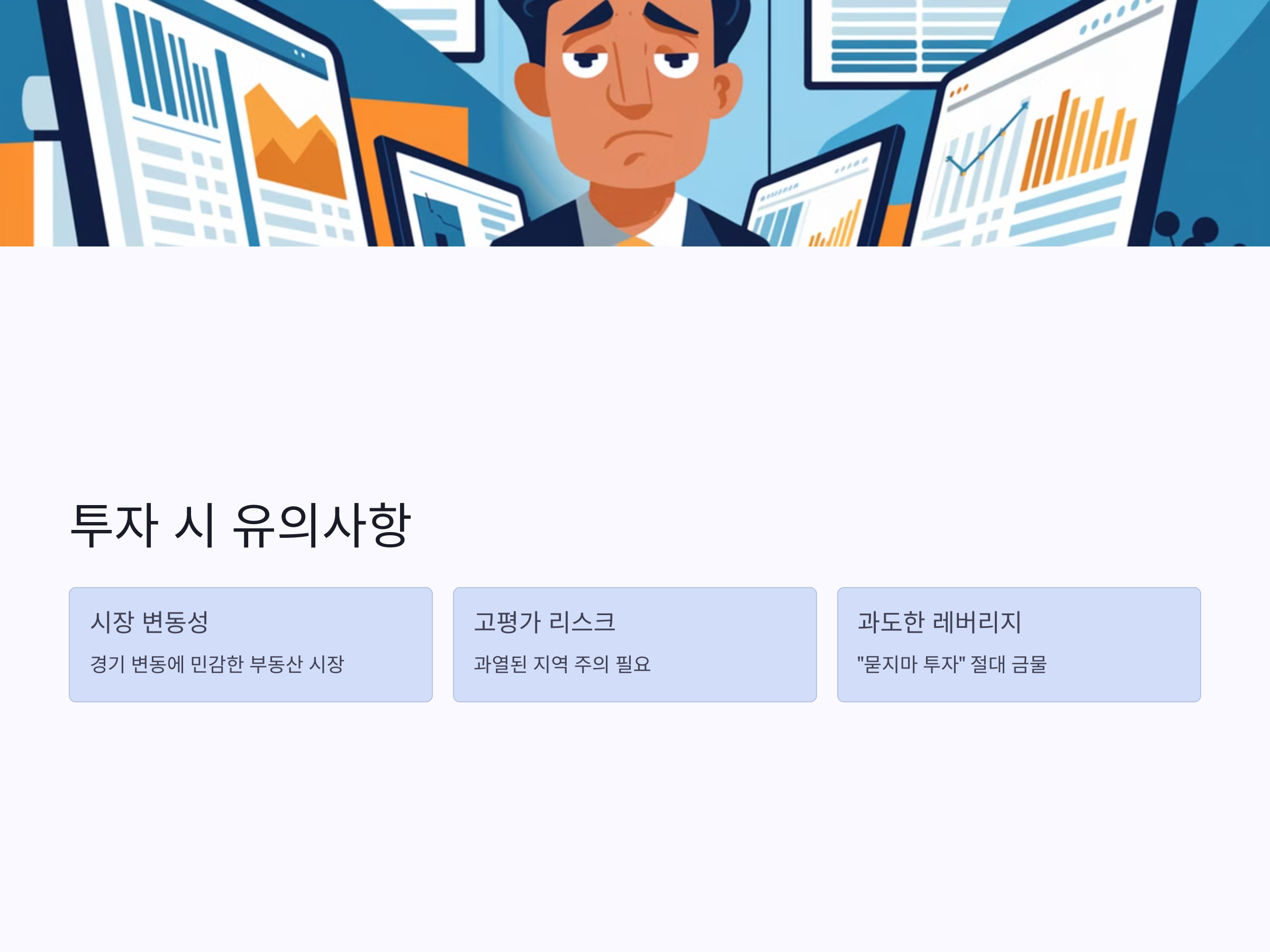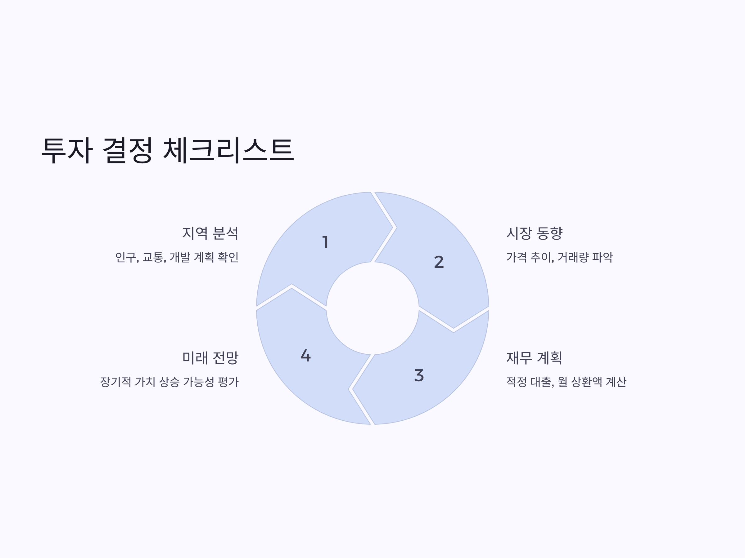 "묻지마 투자"는 절대 금물입니다. 과도한 빚을 내서 투자하는 것도 위험합니다. 자신의 자금 상황에 맞는 투자 계획을 세우고, 장기적인 안목으로 꾸준히 투자하는 것이 성공적인 부동산 투자의 지름길입니다. citeturn0search0
