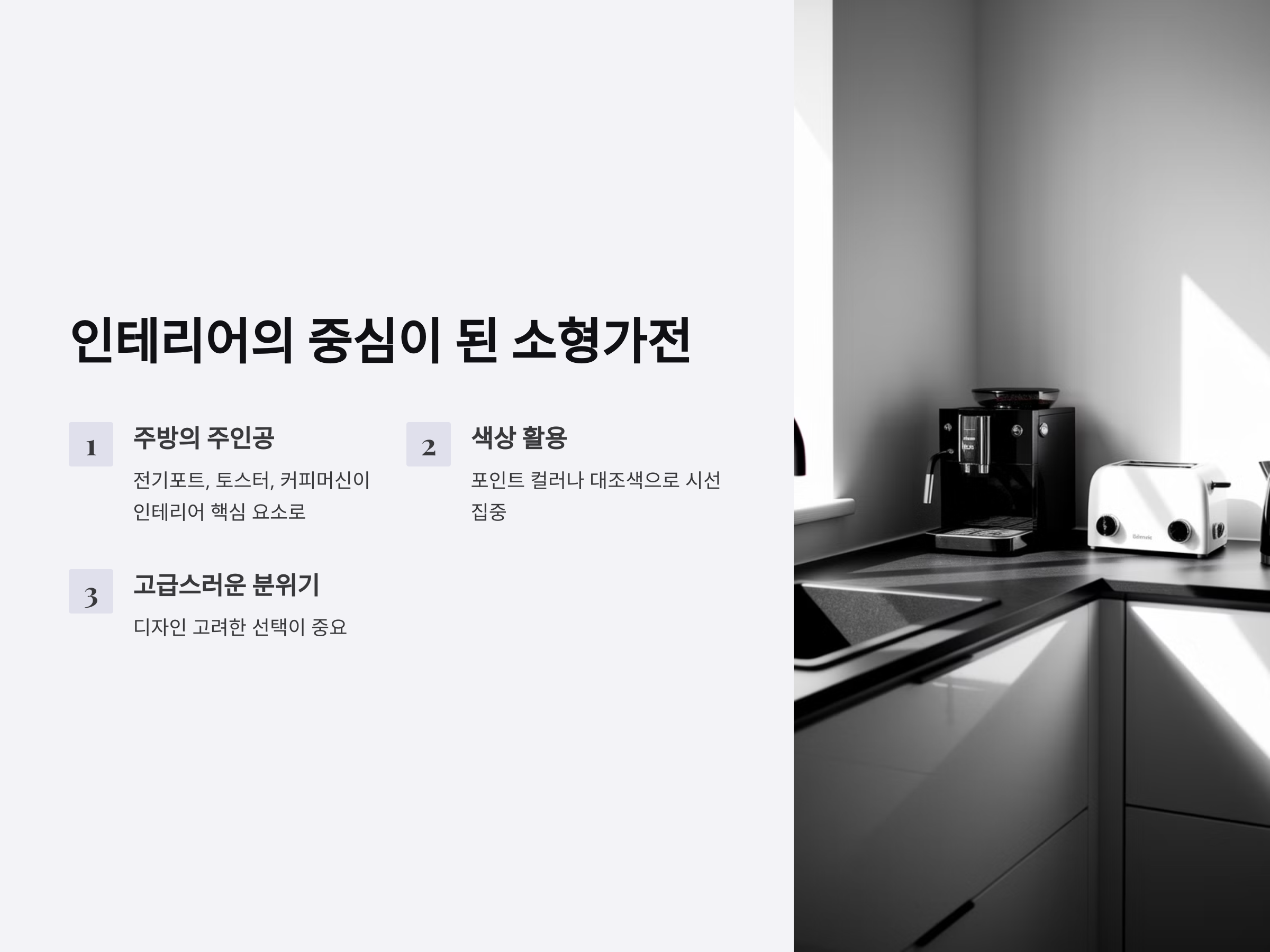 소형가전이 단순히 기능적 용도를 넘어 인테리어의 핵심이 되는 시대입니다. 전기포트, 토스터, 커피머신 등 과거엔 수납장에 숨기기 바빴던 제품들이 이제는 주방의 주인공으로 자리잡고 있는데요. 감각적인 색감과 트렌디한 디자인으로 출시되는 소형가전은 주방 전체 분위기를 결정짓기도 합니다. 색상은 공간의 포인트 컬러와 맞추거나 대조되게 배치해 시선을 끌 수 있습니다. 이처럼 소형가전 하나로도 고급스러운 분위기를 연출할 수 있으니, 디자인을 꼭 고려해 선택하는 것이 좋습니다.
