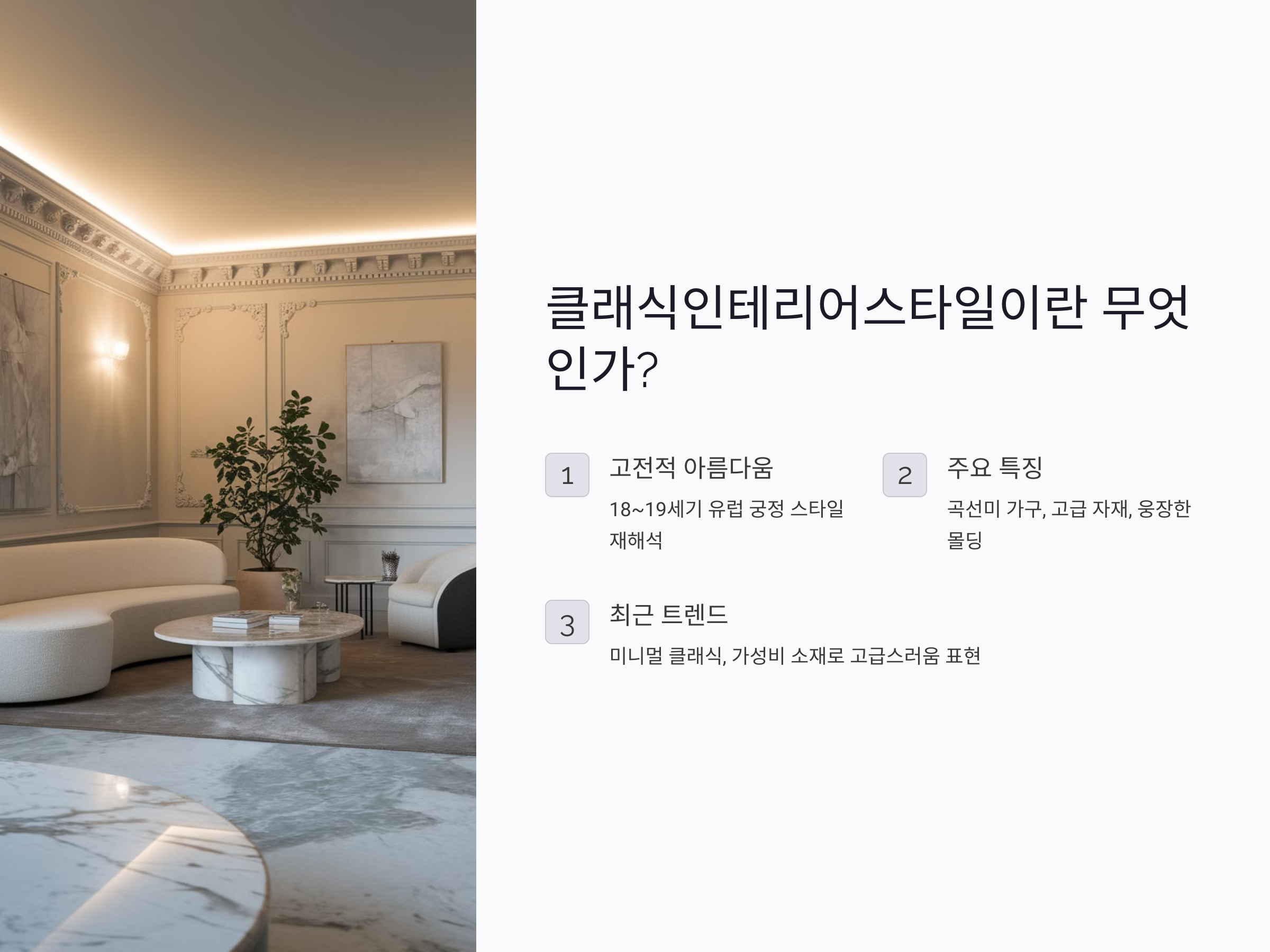 최근 인테리어 시장에서 클래식인테리어스타일이 다시 주목받고 있습니다. 단순한 트렌드를 넘어서 시간이 지나도 변하지 않는 우아함과 품격을 갖춘 디자인으로, 2024년을 맞아 더욱 세련된 방식으로 재해석되고 있습니다. 특히 최근 고급 주거공간이나 상업 공간에서 클래식 디자인을 접목해 차별화를 꾀하는 사례가 늘고 있으며, 전통적인 요소에 현대적 감각을 더한 뉴클래식 스타일이 강세를 보이고 있습니다. 앞으로의 인테리어 트렌드는 지속가능성과 오랜 시간 사랑받을 수 있는 스타일이 중심이 될 것으로 예상되며, 클래식인테리어는 이러한 흐름의 중심에 서게 될 것입니다. 이번 글에서는 클래식인테리어스타일의 핵심 요소부터 최신 적용 사례까지 꼼꼼하게 살펴보겠습니다.