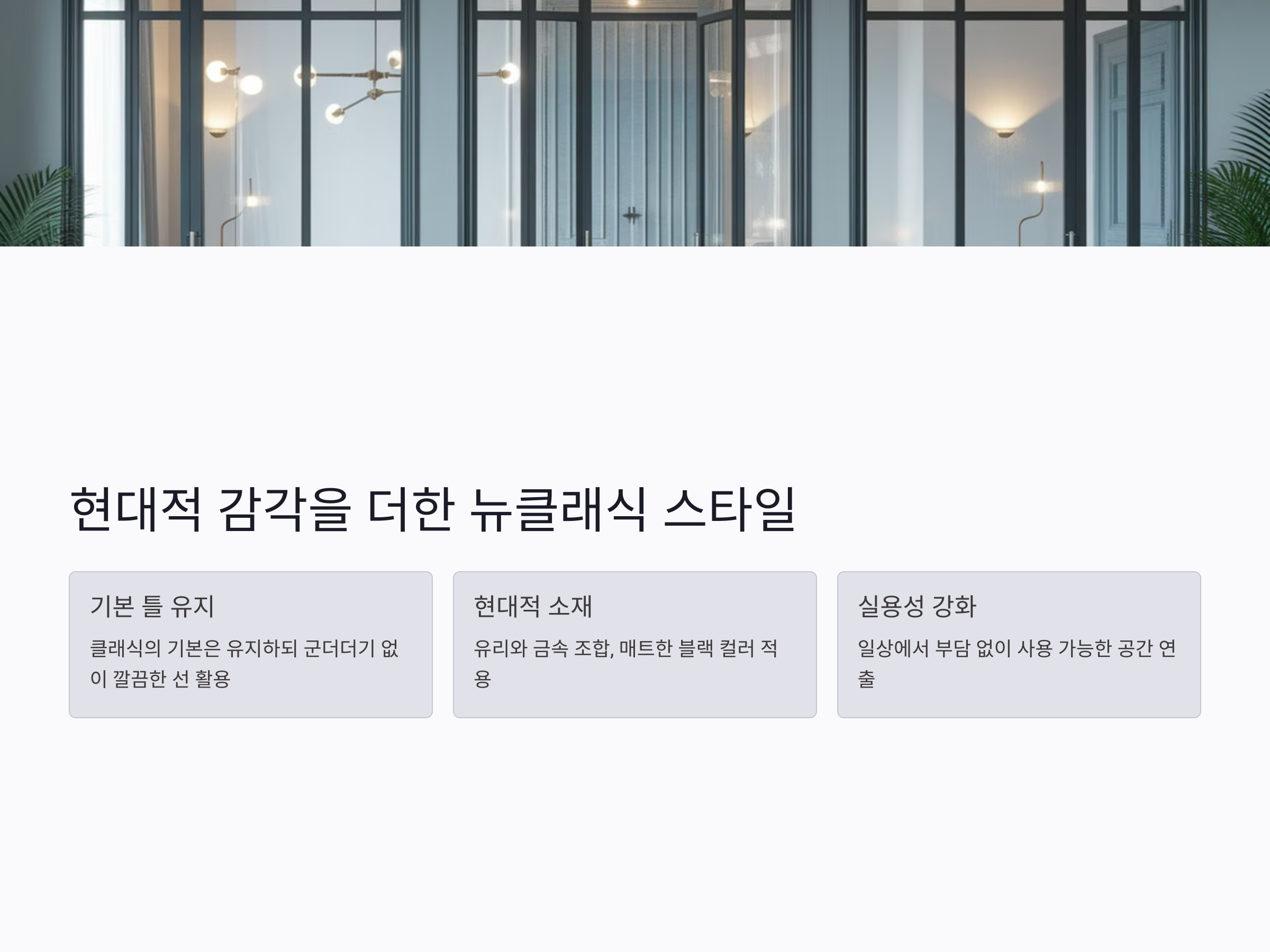최근에는 전통적인 클래식인테리어에 현대적인 요소를 가미한 뉴클래식 스타일이 각광받고 있습니다. 뉴클래식은 클래식의 기본적인 틀은 유지하되, 군더더기 없이 깔끔한 선과 현대적 소재를 활용해 더 실용적이고 트렌디한 공간을 연출합니다. 예를 들어, 클래식한 몰딩 벽면에 매트한 블랙 컬러를 입히거나, 유리와 금속을 조합한 가구를 배치하는 식입니다. 덕분에 클래식이 가진 무거움은 덜고, 일상에서도 부담 없이 사용할 수 있는 공간이 탄생합니다. 특히 아파트 인테리어에 많이 적용되면서 대중화되고 있으며, 비용 면에서도 효율적이라는 장점이 있습니다.