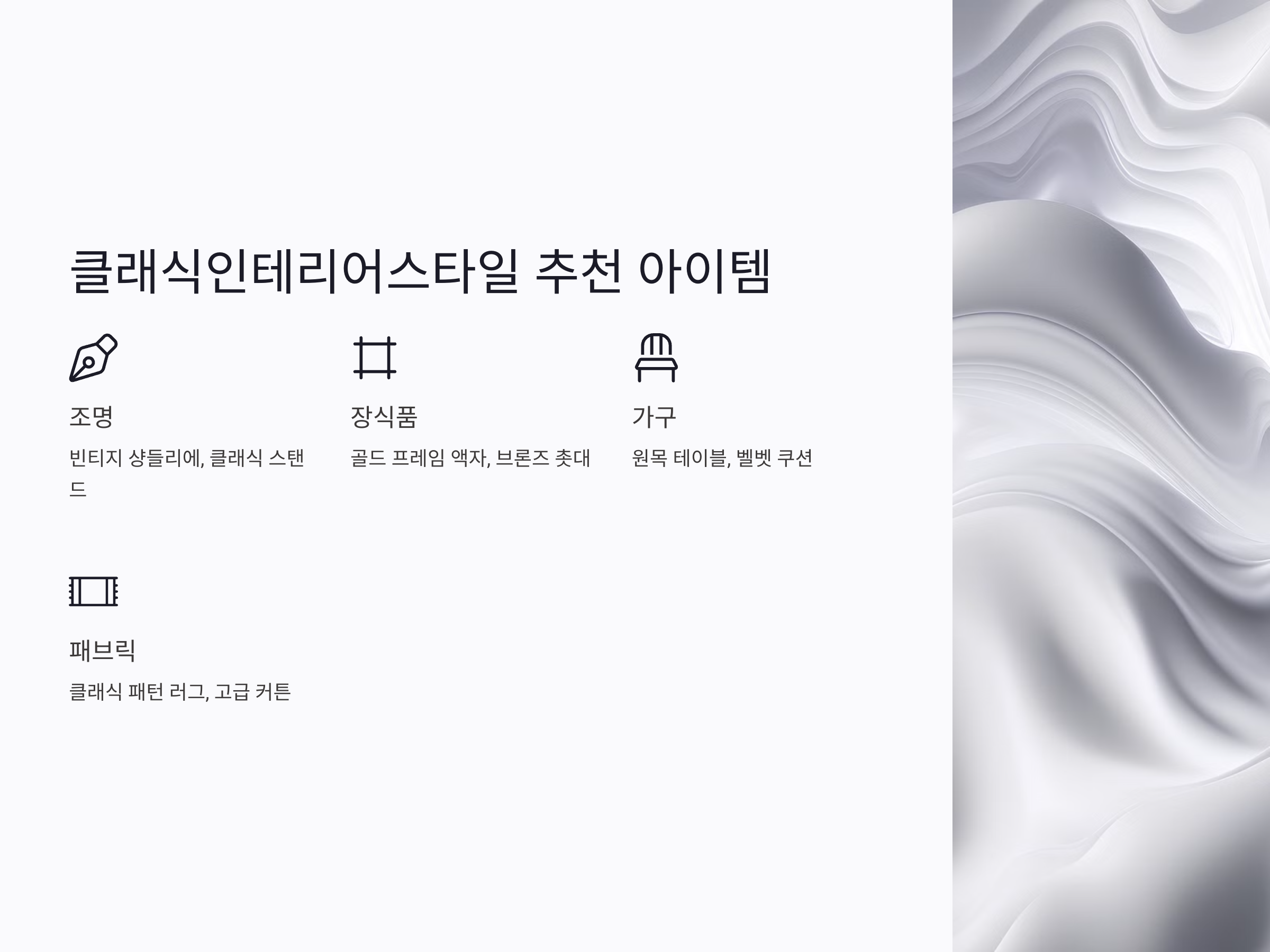 클래식인테리어를 완성하려면 분위기를 살려줄 아이템 선정이 중요합니다. 빈티지 샹들리에, 골드 프레임 액자, 브론즈 촛대, 벨벳 쿠션, 원목 테이블, 대리석 소품 등 클래식한 감각을 더할 수 있는 아이템을 활용해보세요. 이 외에도 클래식 패턴의 러그나 커튼은 공간의 무드를 결정짓는 중요한 요소가 됩니다. 아이템은 공간의 톤과 맞추되, 과하지 않게 배치해야 우아함을 유지할 수 있습니다. 최근에는 온라인에서도 다양한 클래식 소품을 쉽게 구할 수 있어 손쉽게 스타일링이 가능합니다.