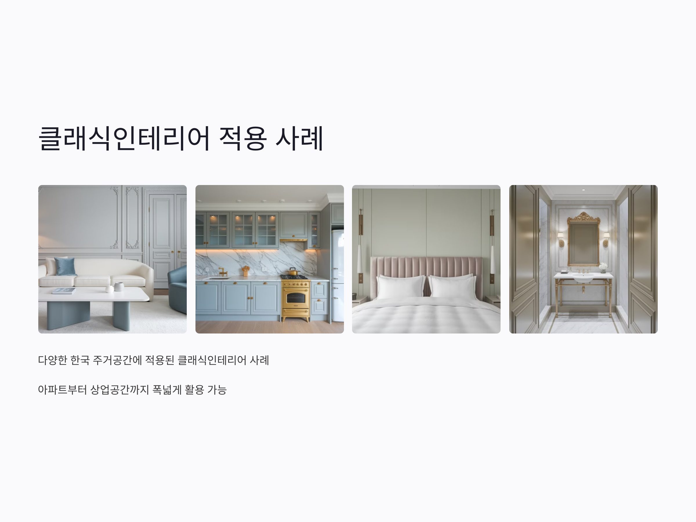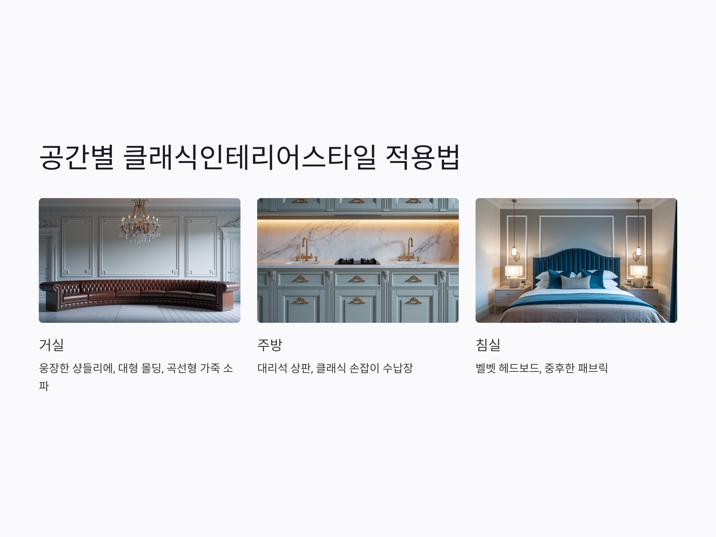 클래식인테리어는 적용하는 공간에 따라 디테일을 달리해야 더욱 멋스럽게 완성됩니다. 거실에는 웅장한 샹들리에와 대형 몰딩 벽이 잘 어울리고, 소파는 곡선형 팔걸이가 있는 천연가죽 소재가 이상적입니다. 주방은 대리석 상판과 클래식한 손잡이가 있는 수납장을 통해 고급스러움을 표현할 수 있습니다. 침실은 벨벳 소재의 헤드보드와 중후한 컬러의 패브릭을 사용하면 품격 있는 분위기를 연출할 수 있습니다. 욕실 역시 골드 포인트의 수전과 클래식 프레임 거울을 활용하면 전체적인 통일감을 줄 수 있습니다.
