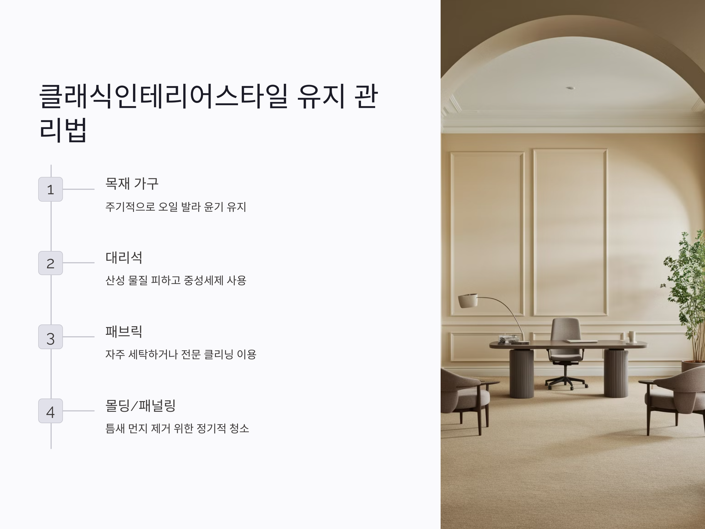 클래식인테리어는 고급 자재가 많이 쓰이기 때문에 유지 관리도 중요합니다. 목재 가구는 주기적으로 오일을 발라 윤기를 유지하고, 대리석은 산성 물질에 취약하기 때문에 중성세제를 사용하는 것이 좋습니다. 패브릭 소품은 먼지가 잘 쌓이므로 자주 세탁하거나 전문 클리닝을 이용해야 합니다. 몰딩이나 패널링 부분도 틈새에 먼지가 끼기 쉬워 정기적인 청소가 필요합니다. 조명 역시 빈티지 제품이 많아 전구 수명 체크와 교체를 자주 해야 분위기를 유지할 수 있습니다.