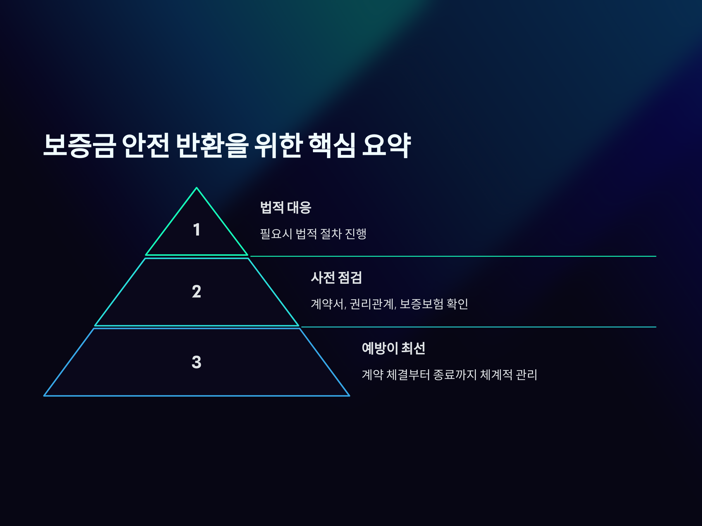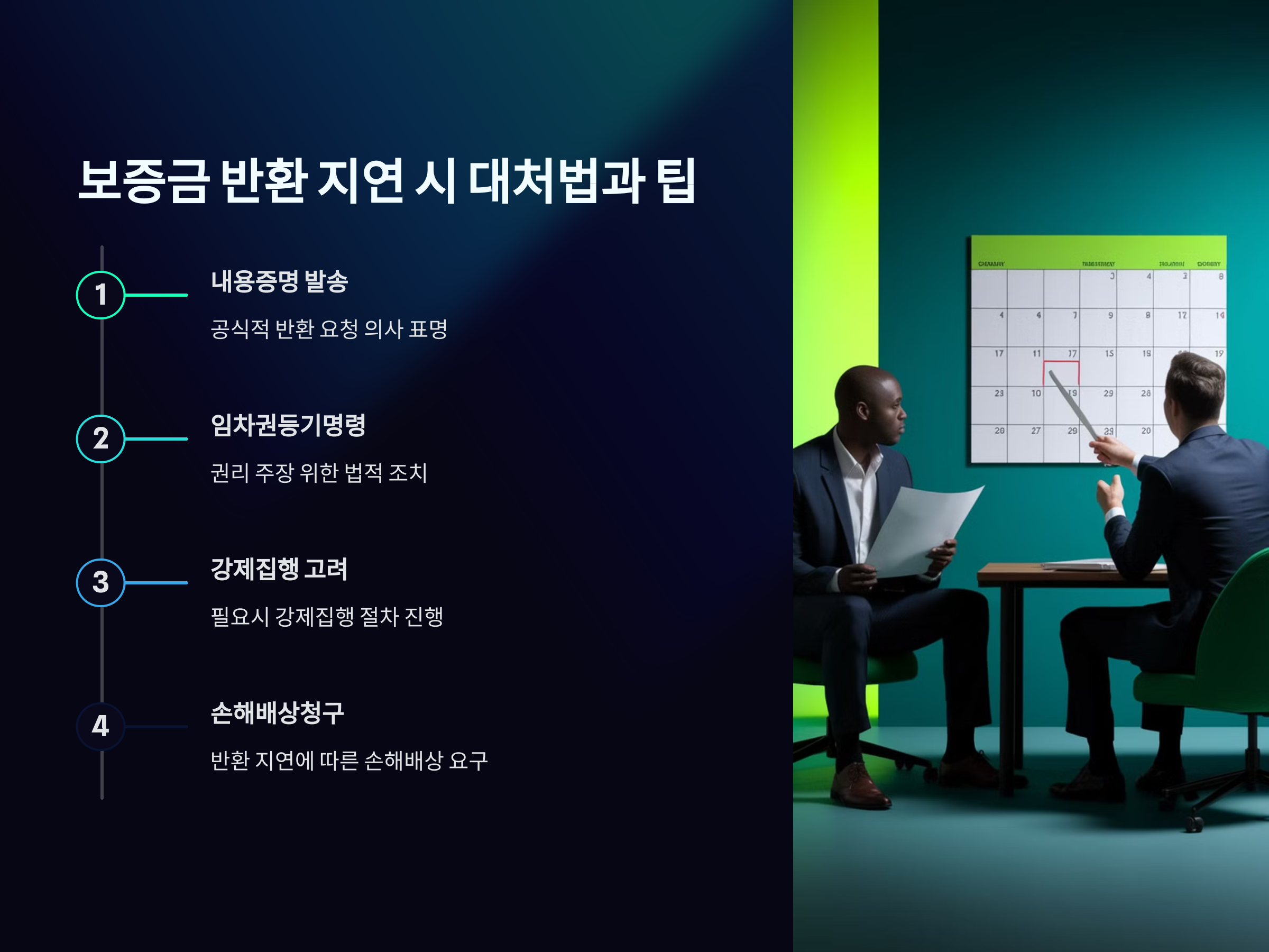 보증금 반환이 지연된다면 감정적으로 대응하기보다는 법적 절차를 차근차근 진행하는 것이 중요합니다. 가장 먼저 내용증명을 발송해 공식적인 반환 요청 의사를 밝히세요. 다음으로 임차권등기명령을 통해 권리를 주장하고, 필요하다면 강제집행까지 고려할 수 있습니다. 또, 반환 지연에 따른 손해배상청구도 가능하니 전문 법률가와 상담을 통해 적극적으로 대응하세요. 무엇보다 사전에 반환 리스크를 줄이는 것이 최선의 방법임을 명심하세요.