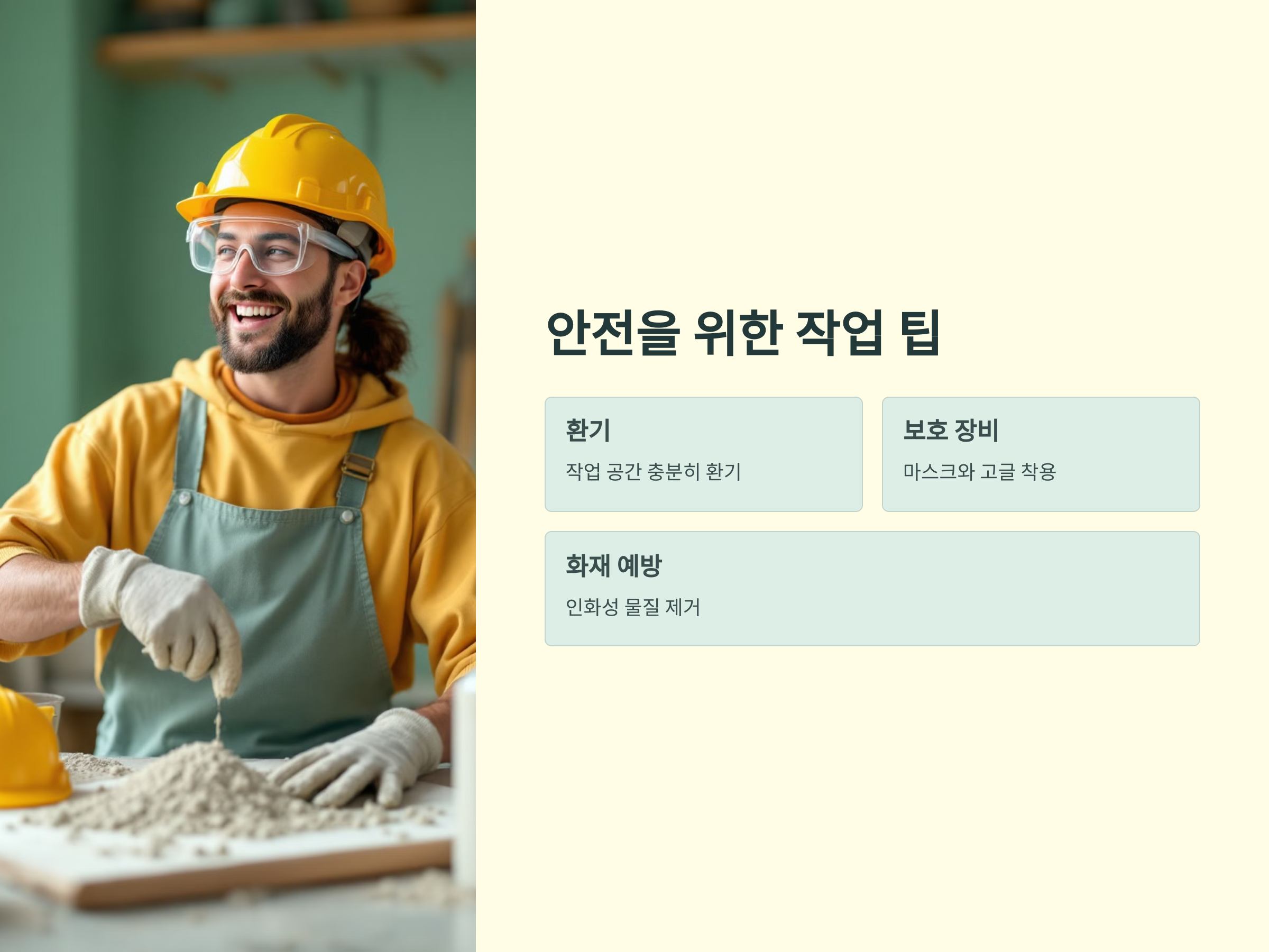 - 보호 장비 착용: 가루 입자 흡입을 막기 위해 마스크와 고글을 반드시 착용.