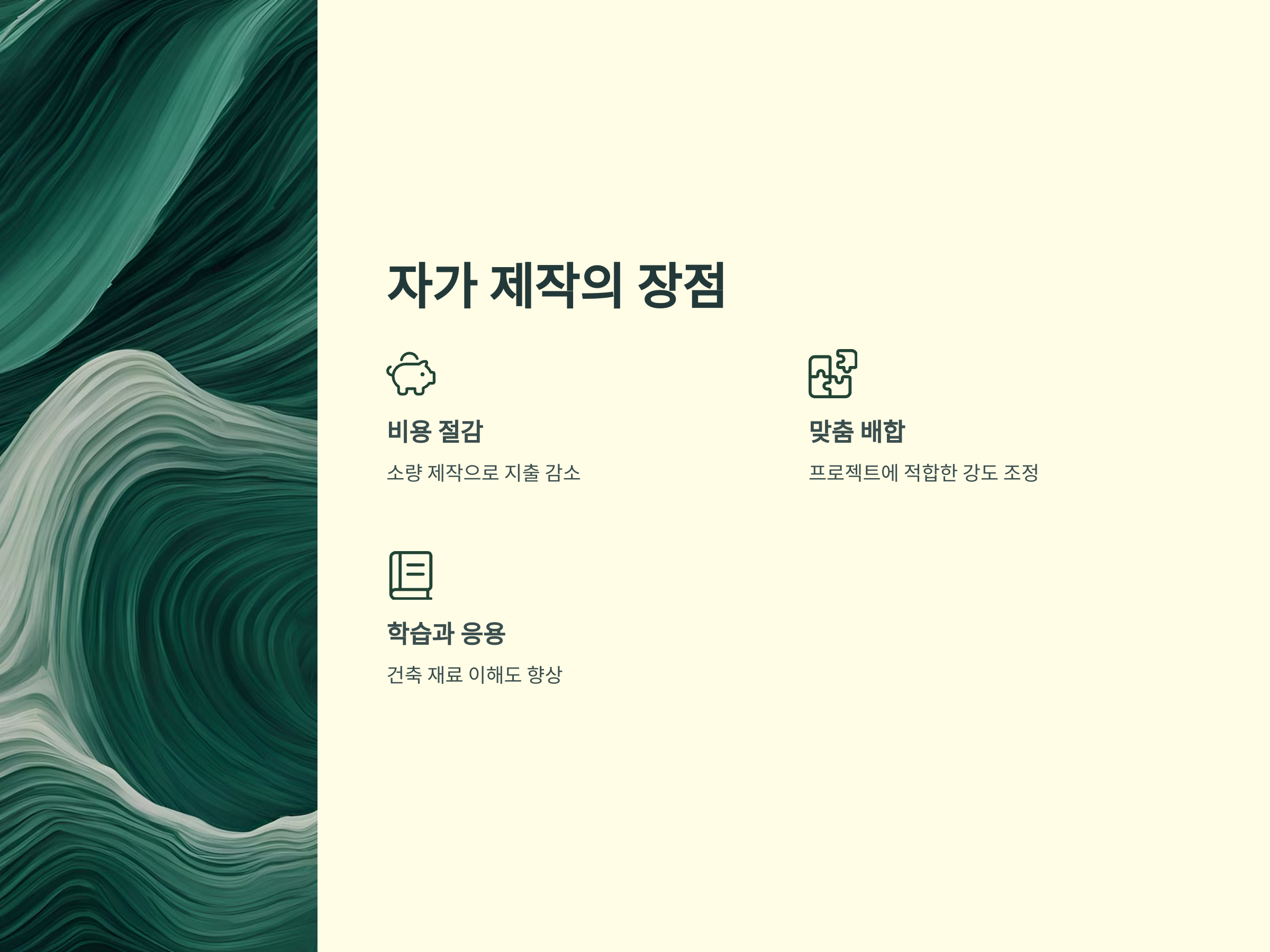 - 필요에 따른 맞춤 배합: 프로젝트에 적합한 강도와 성질 조정 가능.