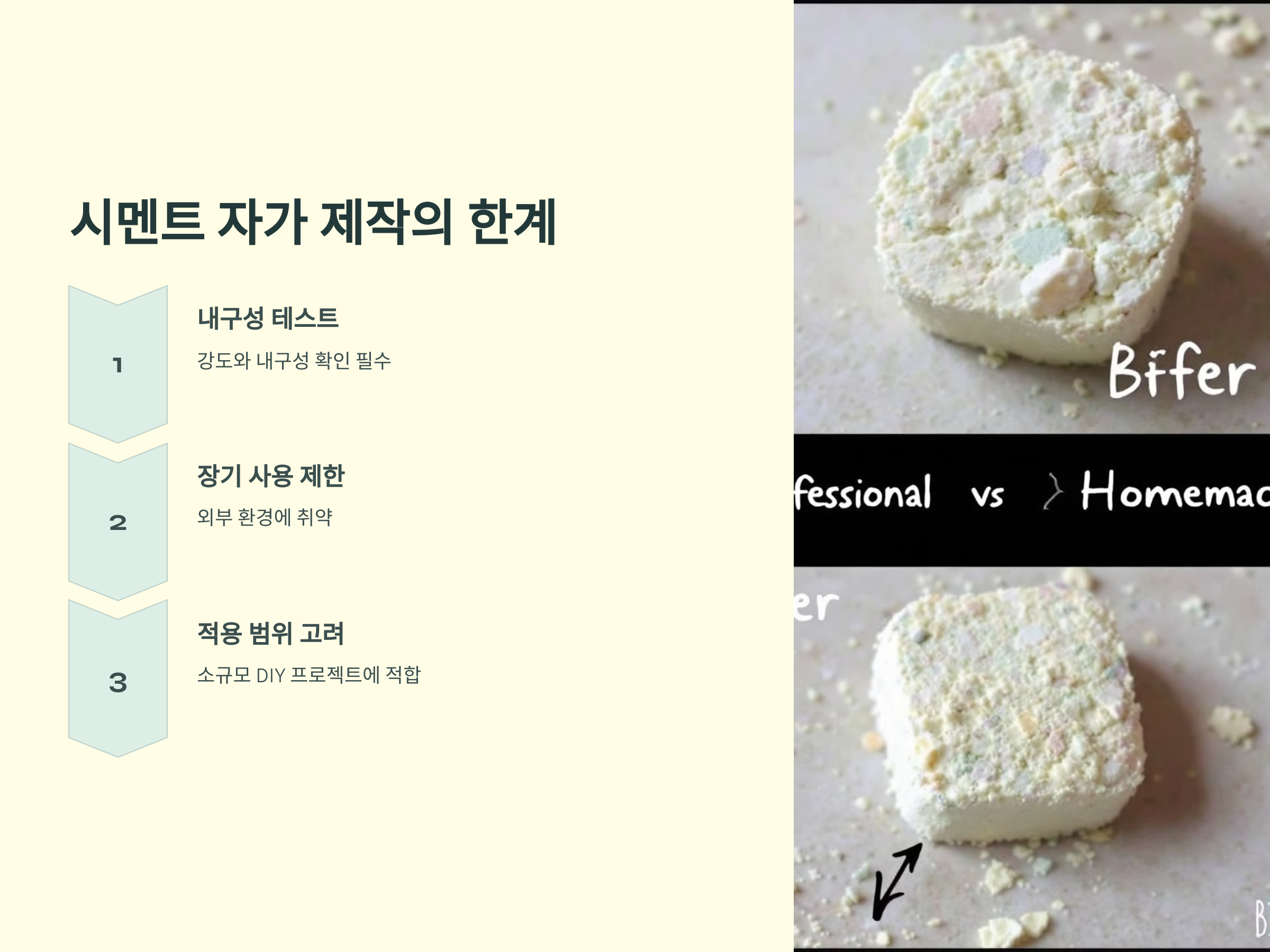 그러나 상업용 시멘트만큼 강도가 높지 않을 수 있으므로, 자가 제작 시 사용 목적과 한계를 분명히 이해해야 합니다.