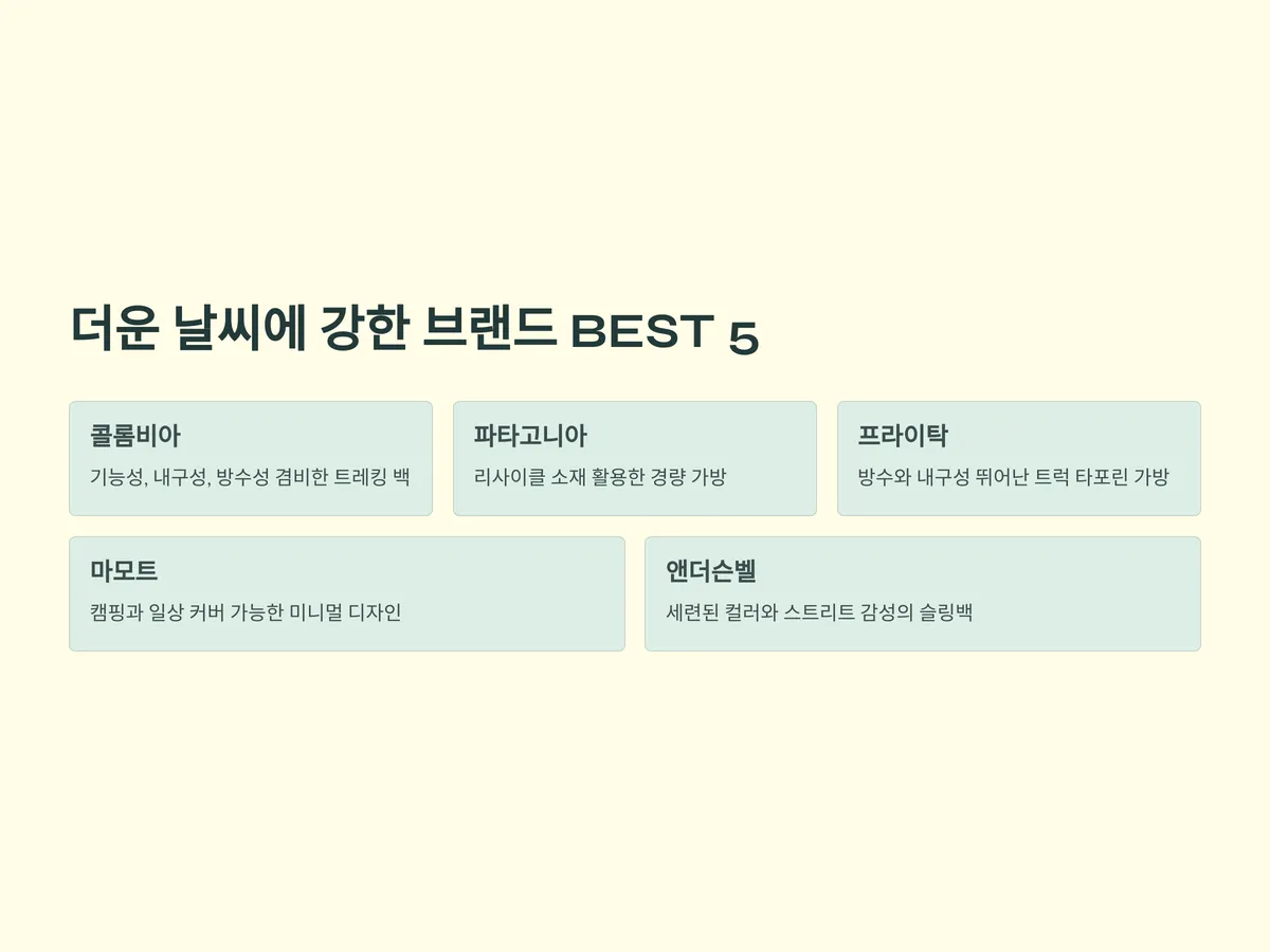 여름철에도 강력하게 추천할 수 있는 브랜드 5가지를 엄선했습니다. 각각의 브랜드는 여름용 가방 컬렉션을 따로 출시하거나, 아웃도어와 패션을 접목한 하이브리드 디자인으로 호평을 받고 있습니다.