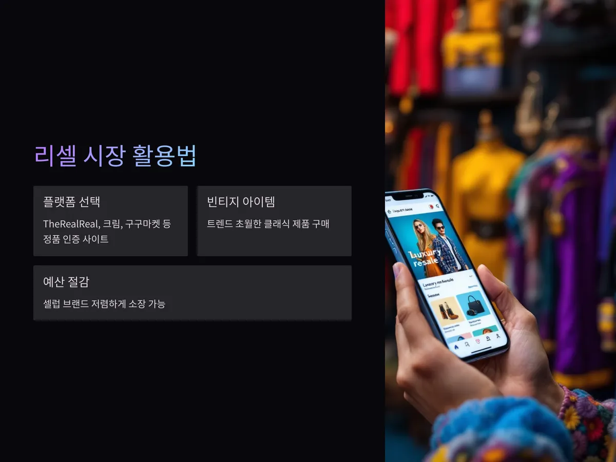 2025년 현재 리셀 시장은 MZ세대를 중심으로 급성장하고 있습니다. 셀럽들이 입던 브랜드 제품을 중고로 구매하거나, 희소성 있는 빈티지 아이템을 통해 자신만의 셀럽룩을 완성할 수 있죠. 특히 ‘TheRealReal’, ‘크림’, ‘구구마켓’ 등의 플랫폼에서는 정품 인증을 받은 제품만 거래되므로 신뢰도도 높습니다.