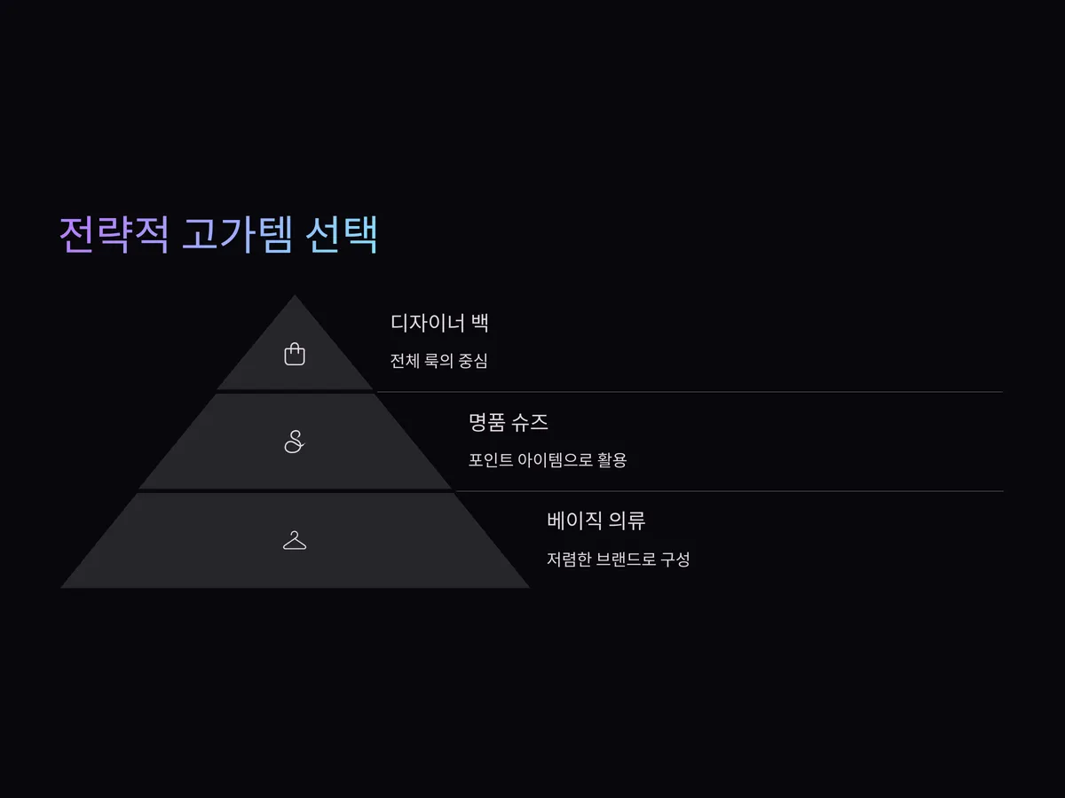 모든 셀럽 아이템이 고가라고 해서 모두 따라 할 필요는 없습니다. 오히려 특정 아이템에 집중해 고가템을 전략적으로 활용하는 것이 훨씬 스마트하죠. 예를 들어, 디자이너 백이나 슈즈처럼 전체 룩의 중심을 잡아주는 포인트 아이템에 투자하는 것이 좋습니다.