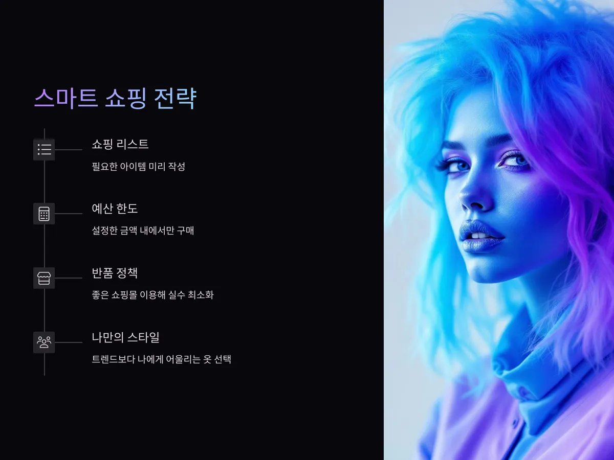 마지막으로 중요한 것은 충동구매를 피하고, 전략적으로 쇼핑하는 것입니다. 셀럽룩을 만든다는 목표 아래 쇼핑 리스트를 미리 작성하고, 예산 한도 내에서만 소비하는 원칙을 세우는 게 좋습니다. 또한 반품 정책이 좋은 쇼핑몰을 이용해 실수를 최소화하세요.