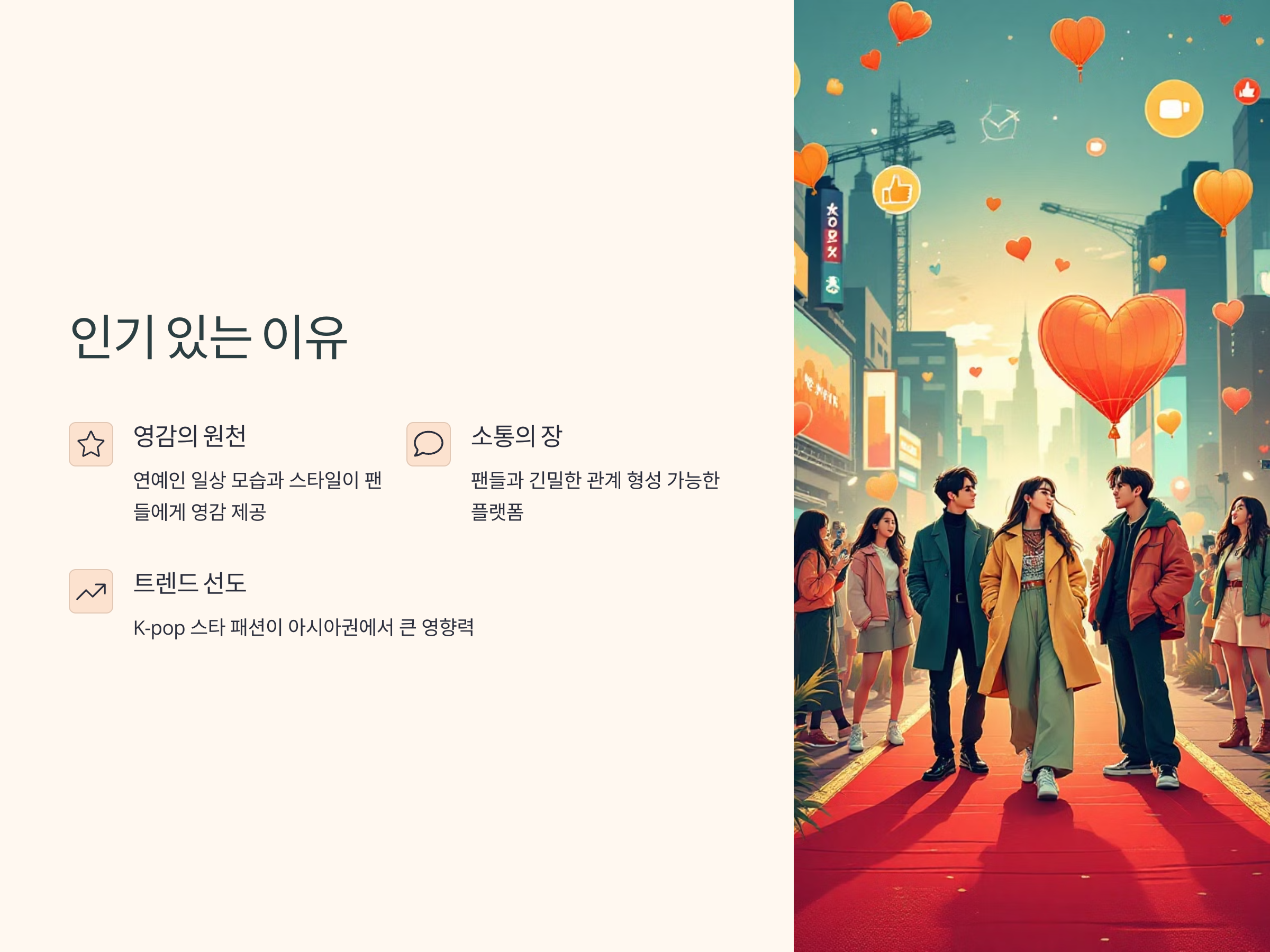연예인 패션 유튜브 채널의 인기는 이러한 요소들이 맞물려 더욱 크게 작용하는데, 특히 한국을 비롯한 아시아권에서는 K-pop 스타들의 패션이 큰 영향을 미치고 있습니다. 팬들은 그들의 스타일을 따라 하고 싶어 하기 때문에, 연예인들의 의상, 액세서리, 헤어스타일 등을 분석하는 유튜브 채널은 자연스럽게 성장하고 있습니다.