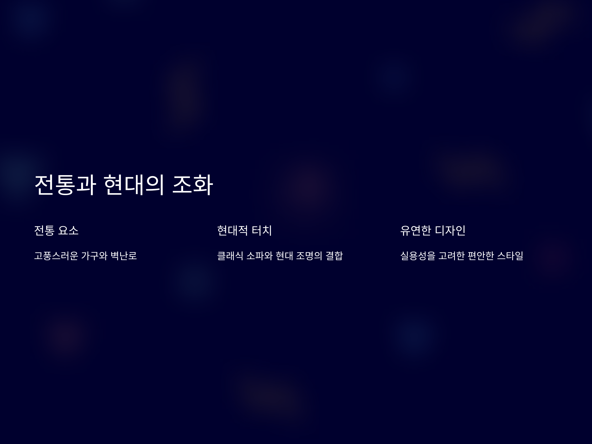 공간 배치는 전통적인 느낌을 살리면서도 현대적인 실용성을 고려해 배치됩니다. 예를 들어, 큰 거울이나 미니멀한 조명을 배치하여 공간을 더 개방적이고 여유롭게 만들어줍니다. 또한, 고급스러운 가구들이나 장식품들을 적절하게 배치하여, 균형 잡힌 아름다움을 연출합니다.