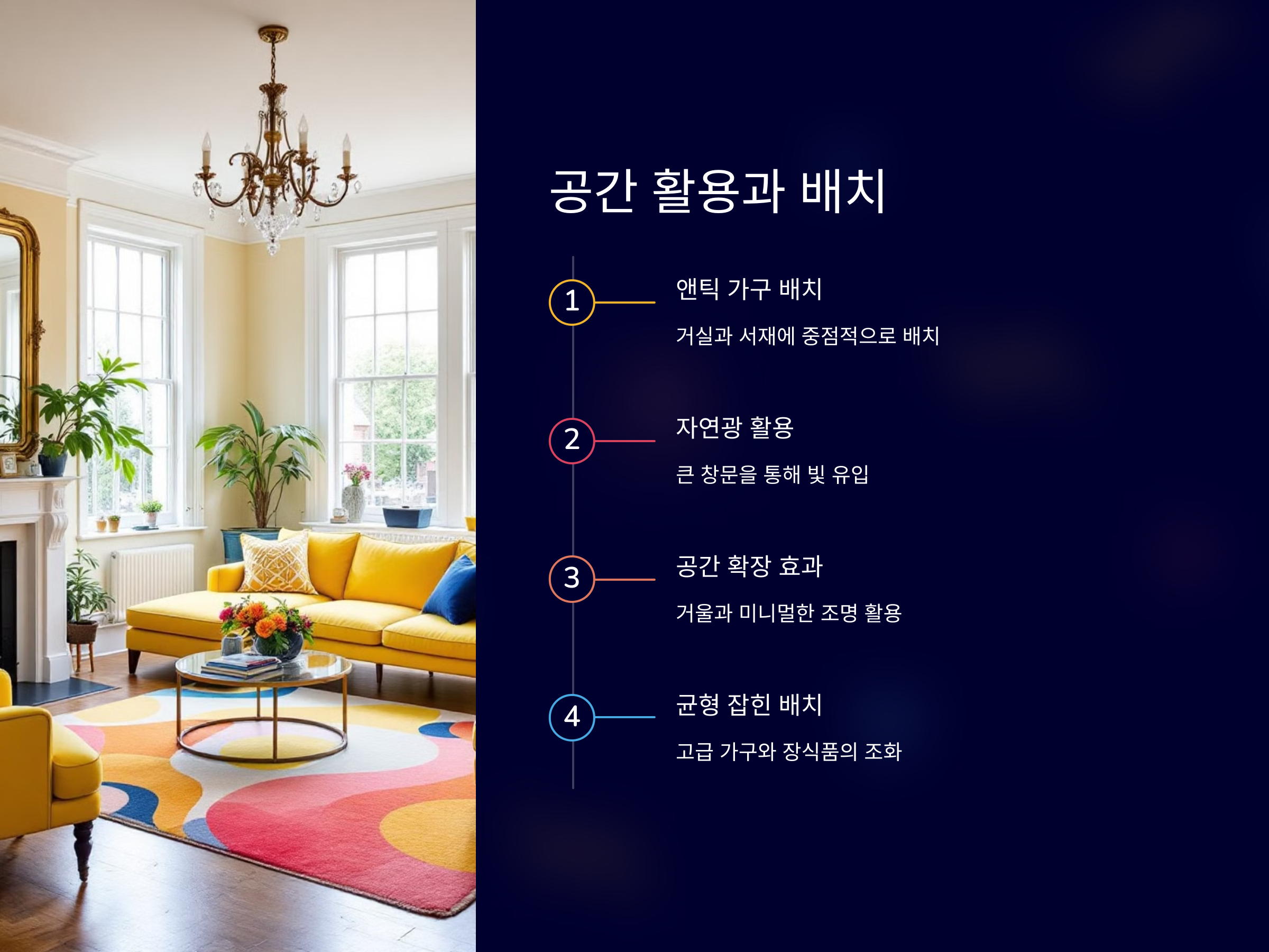 영국 인테리어 스타일에서는 공간 활용이 중요한 요소로, 집 안의 각 공간을 효율적으로 활용하는 것이 특징입니다. 특히, 거실이나 서재 같은 중요한 공간에는 앤틱 가구를 배치하고, 편안한 분위기를 연출합니다. 또한, 방에 있는 큰 창문을 통해 자연광을 최대한 유입시키는 것이 중요하며, 이를 통해 공간을 밝고 넓게 보이도록 합니다.