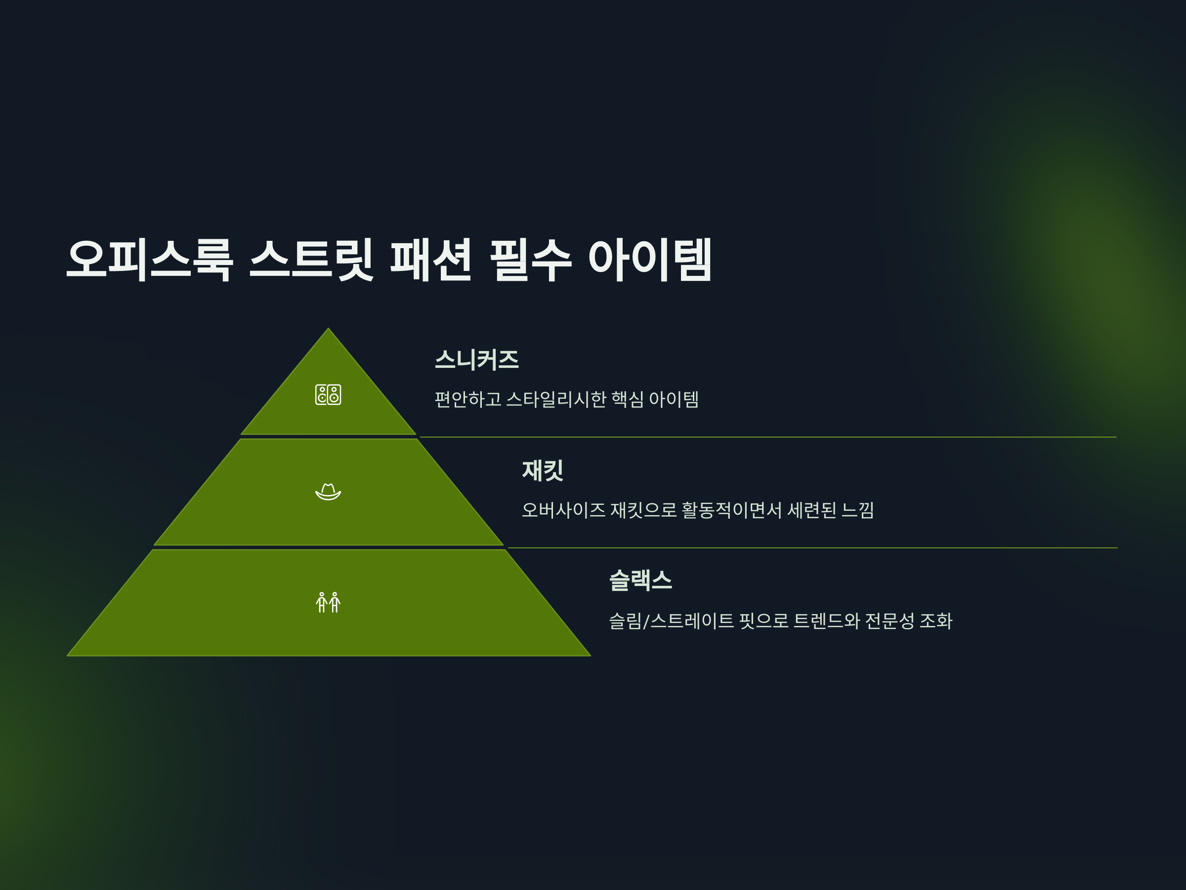 오피스룩 스트릿 패션을 제대로 즐기기 위해서는 몇 가지 필수 아이템들이 필요합니다. 첫 번째로는 '스니커즈'입니다. 스니커즈는 오피스룩 스트릿 패션의 핵심 아이템으로, 편안하면서도 스타일리시한 느낌을 제공합니다. 특히, 고급스러운 디자인의 스니커즈는 직장에서도 충분히 어울립니다.