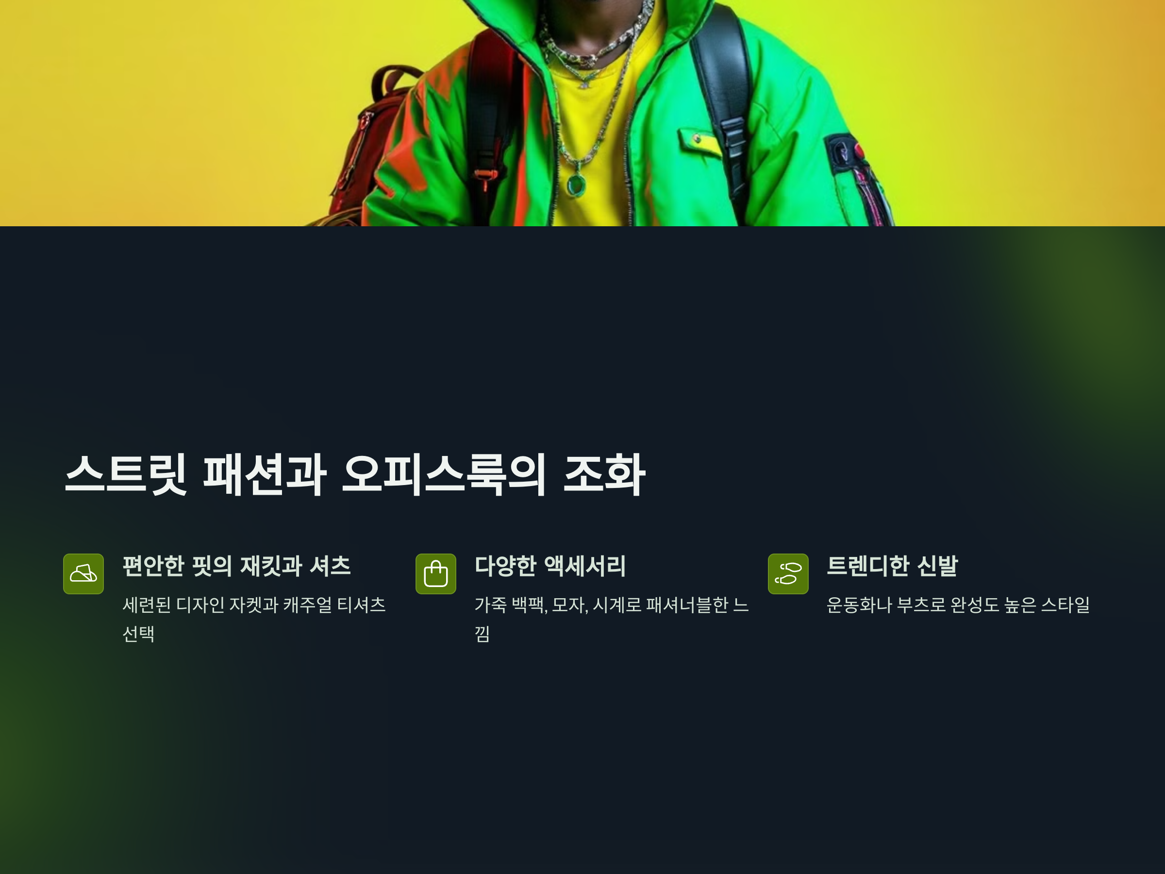 스트릿 패션에서 중요한 부분은 바로 액세서리입니다. 남성의 오피스룩 스트릿 패션에서는 간결하지만 효과적인 액세서리 사용이 필수적입니다. 예를 들어, 스니커즈나 가죽 백팩, 심플한 시계 등을 활용하면, 편안하면서도 세련된 스타일을 연출할 수 있습니다. 또한, 컬러 매치를 잘 활용하여 한 톤으로 꾸미는 것도 좋은 방법입니다.