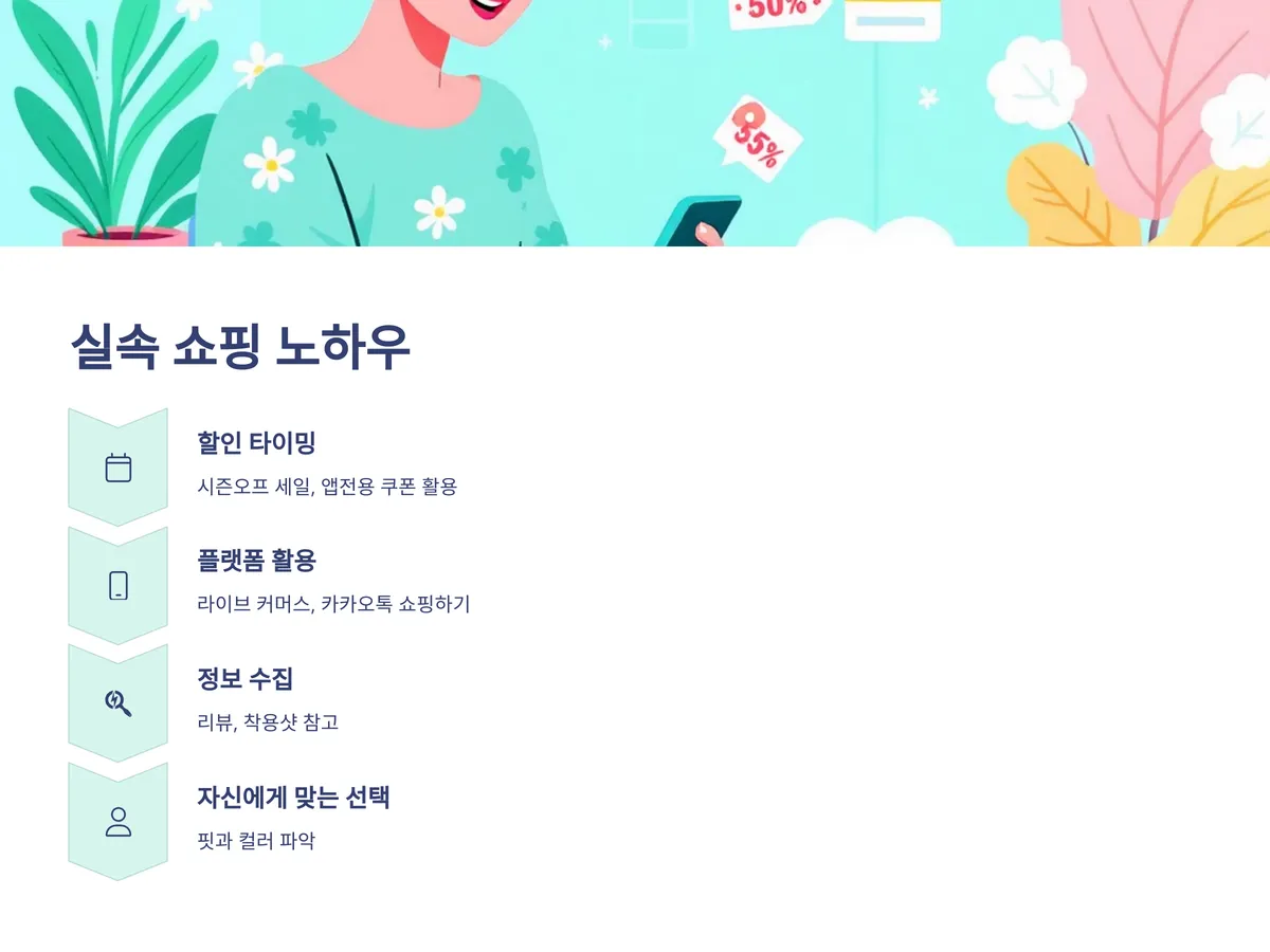 가성비 쇼핑의 핵심은 할인 타이밍을 제대로 아는 것입니다. 브랜드의 시즌오프 세일, 앱전용 쿠폰, 첫구매 이벤트 등을 놓치지 말고 적극 활용하세요. 요즘은 라이브 커머스에서도 특가 아이템이 많이 나오고, 카카오톡 쇼핑하기나 네이버 스마트스토어에서도 시즌별 이벤트를 자주 하니 알림설정을 해두는 것이 좋아요. 또한, 자신에게 어울리는 핏과 컬러를 파악하고 선택하는 것이 실패 없는 쇼핑의 지름길입니다. 리뷰나 착용샷을 참고하면 더 현명한 소비가 가능하죠.